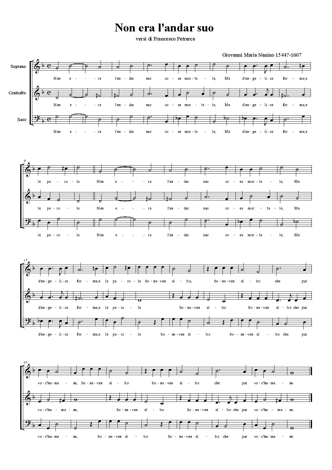 Not to be confused with the second part of the madrigal Erano i capei d'oro, which is also "Non era l'andar suo". However, although the melodies are similar, they are not exactly the same, and that madrigal is for 5 voices, while this canzonetta is for 3 voices.