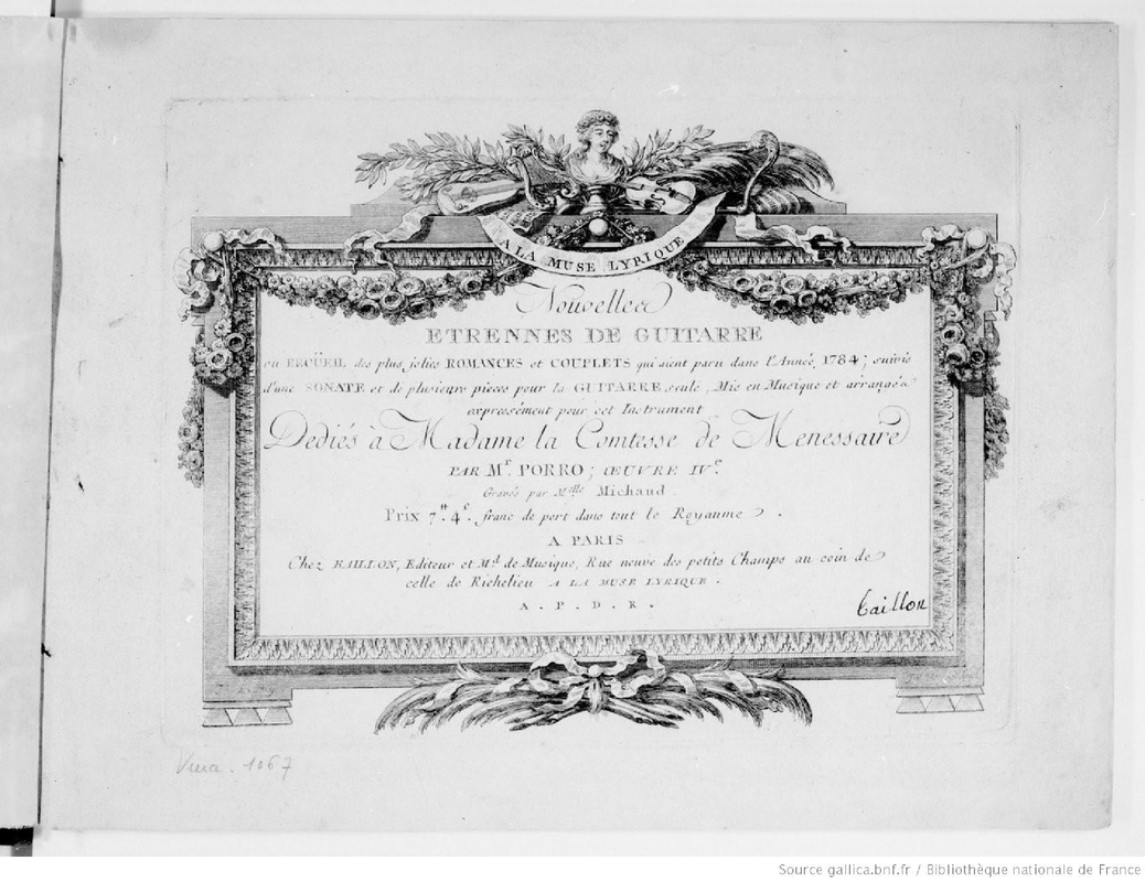 | Alternative. Title | Nouvelles étrennes de Guitarre ou Recueil des plus jolies Romances et Couplets qui aient paru dans l'année 1784, suivis d'une Sonate et de plusieurs pièces pour la Guitarre seule, mis en musique et arrangés expressément pour cet instrument |