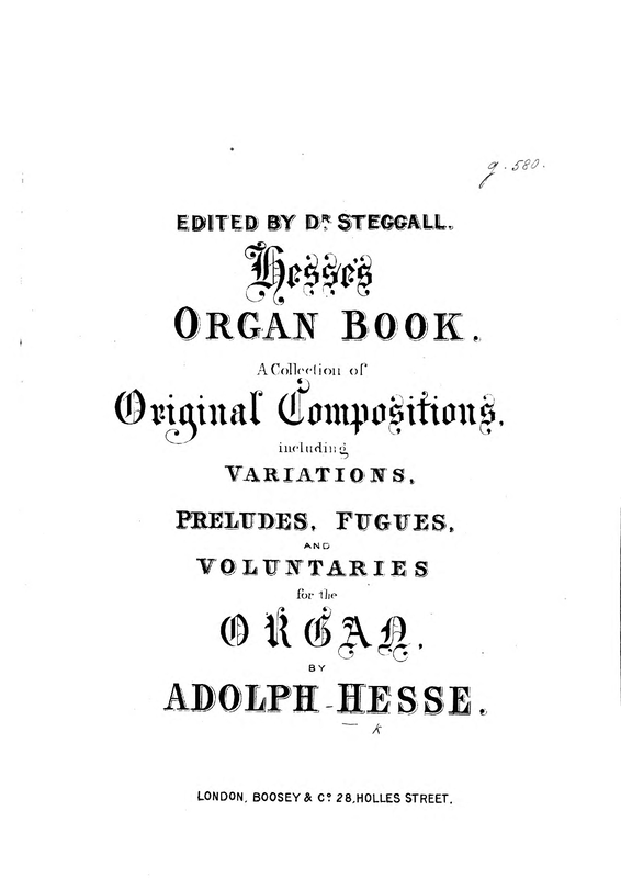 | Alternative. Title | Edited by Dr. Steggall. Hesse's Organ Book. A Collection of Original Compositions, including Variations, Preludes, Fugues, and Voluntaries for the Organ by Adolph Hesse |