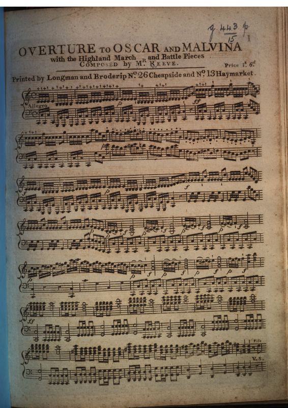 The Overture, Favorite Songs, Duetts & Chorusses in the Grand Pantomime Ballet of Oscar and Malvina as performed with universal applause at the Theatre Royal Covent Garden, Together with a Selection of the most favorite Scots Airs & the Battle Piece, The whole adapted and the new Music Composed by W. Reeve. Overture includes orchestral cues. Andante in D major is scored for [uilleann] pipes and harp.
