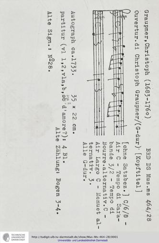 Upcoming recording (Nov.2013, on Ondine) lists as "Suite for viola d'amore bassoon strings and cembalo in G GWV 458". An edition has been published commercially by Prima la musica! in 2012, volume 58 of their Graupner complete overtures