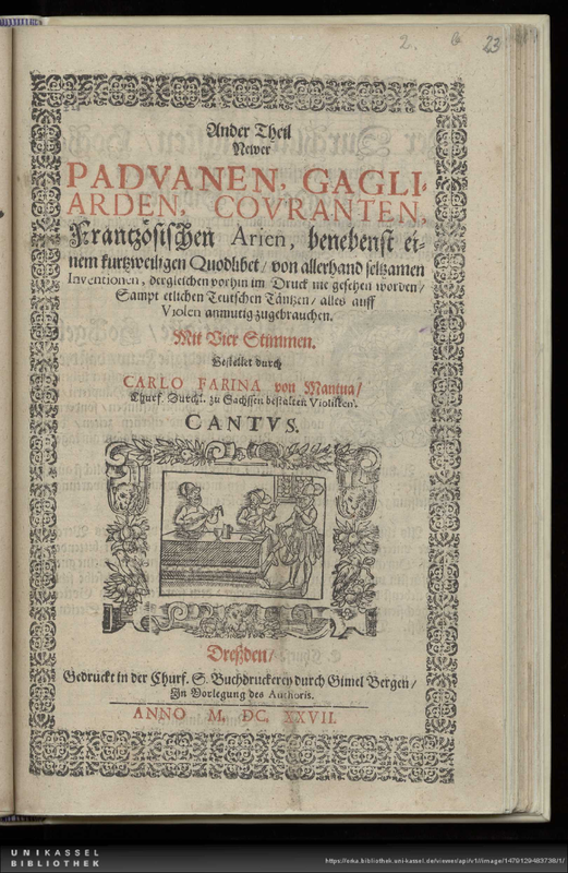 Ander Theil Newer Padvanen, Gagliarden, Covranten, Frantzösischen Arien, benebenst einem kurtzweiligen Quodlibet, von allerhand seltzamen Inventionen, dergleichen vorhin im Druck nie gesehen worden. Sampt etlichen Teutschen Täntzen, alles auff Violen anmutig zugebrauchen. Mit Vier Stimmen
