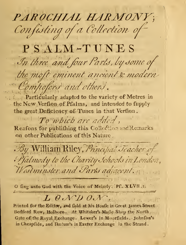Parochial Harmony. Consisting of a Collection of Psalm-Tunes. In three and four Parts, by some of the most eminent ancient & modern Composers and others. Particularly adapted to the variety of Metres in the New Version of Psalms, and intended to supply the great Deficiency of Tunes in that Version. To which are added, Reasons for publishing this Collection and Remarks on other Publications of this Nature. By William Riley, Principal Teacher of Psalmody to the Charity Schools in London, Westminster and Parts adjacent.