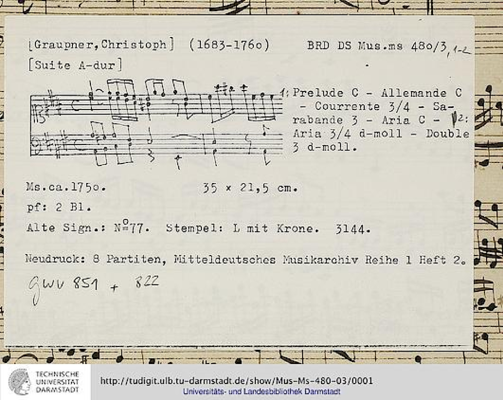Contains both the suite in A major, GWV 851 as well as an Aria with double in D minor, GWV 822