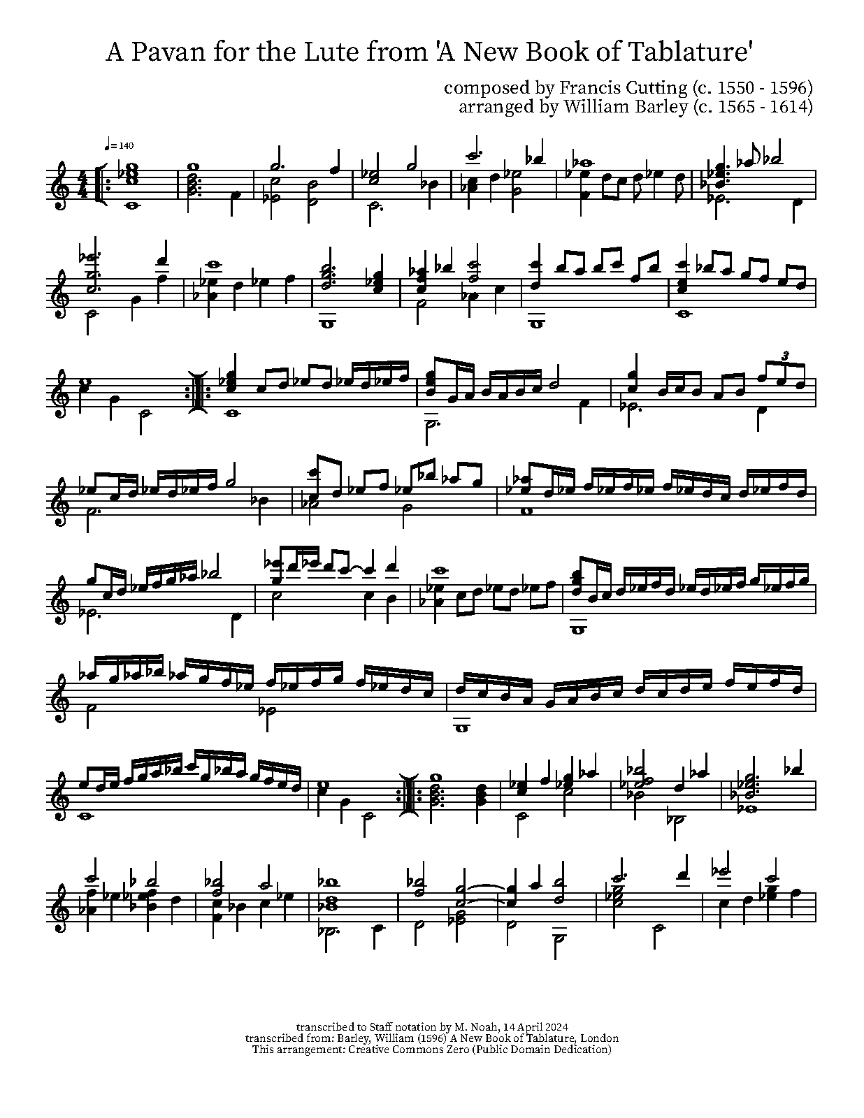 This Pavan is No.9 in Jan W.J. Burgers: Francis Cutting. Collected Lute Music, Tree edition, Lübeck 2002. See his explanations, restored lute tablature and piano style transcription. 4 versions exist (e.g. this one, from William Barley: A New Book of Tabliture [for the Lute], London 1596, ff. D1v-3r) plus a fragmented consort setting probably not set by Cutting.