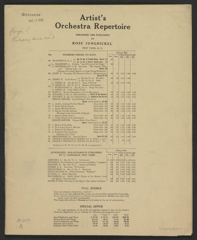 | Extra Information | A series for film/depicted-film music by the composer, arranged to orchestra and published by Ross Jungnickel (1875–1962). Original instrumentation unknown. |