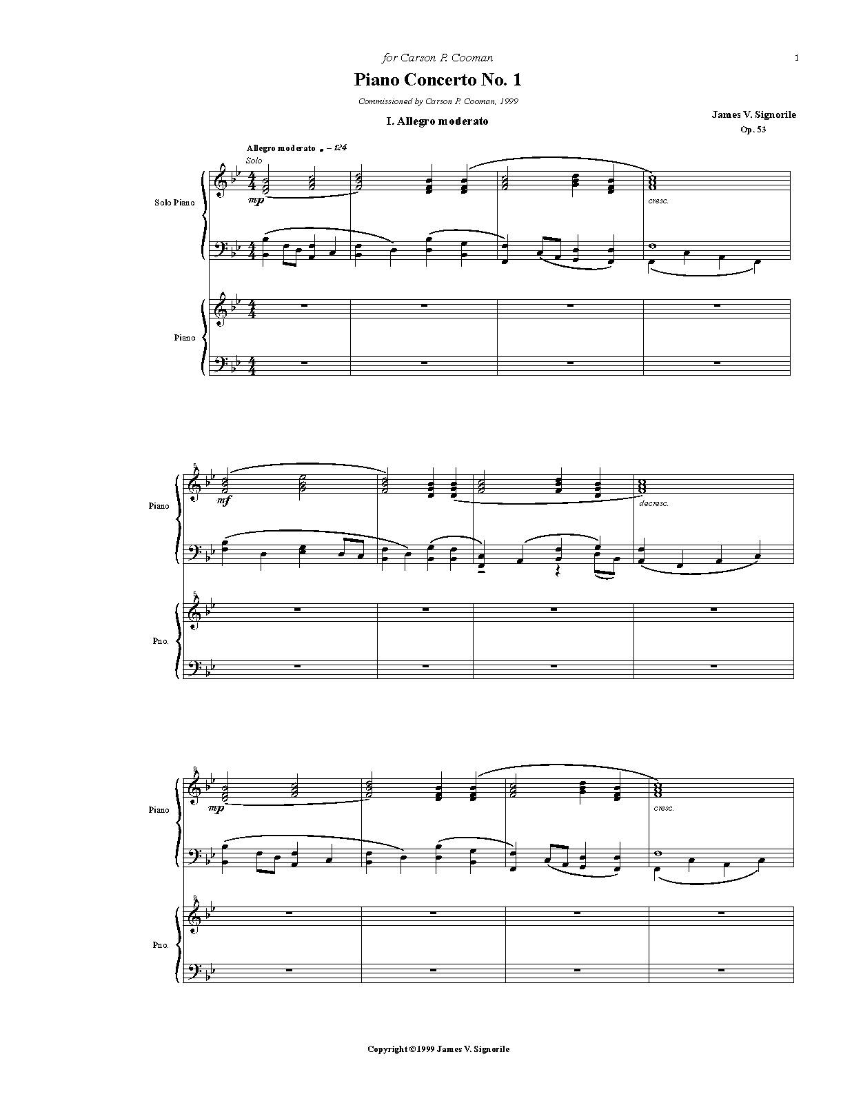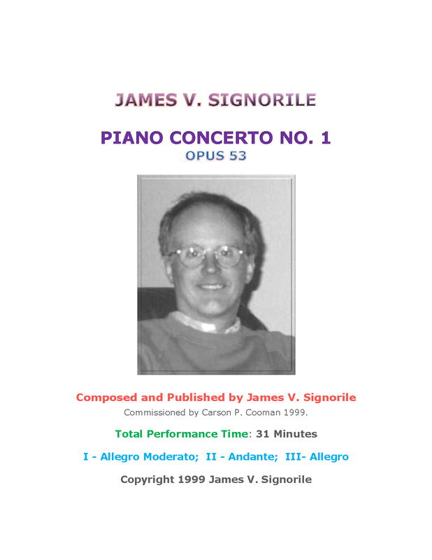Piano Concerto No. 1, Op. 53. in 3 Movements. Composed by James V. Signorile. Full Orchestral (Conductors) Score. 216 pages. Duration approx. 31 minutes. All Parts, Piano Solo and a 2-Piano reduction are also included in this one PDF file. Commissioned in 1999 by Carson P. Cooman. MIDI Rendering by Steve Mitchell. Published by James V. Signorile. Copyright (©) 1999 James V. Signorile.