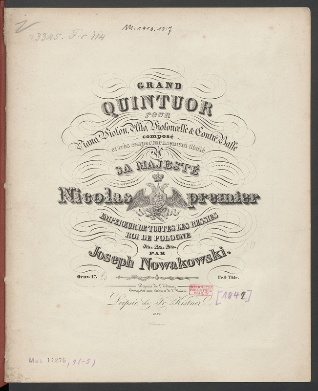 | Extra Information | This work was unknown until the Kistner parts were discovered in the Staatsbibliothek zu Berlin in 2003. The first modern edition is from 2010 by Polskie Wydawnictwo Muzyczne. It is actually the second piano quintet by Nowakowski, but the first is still lost. |