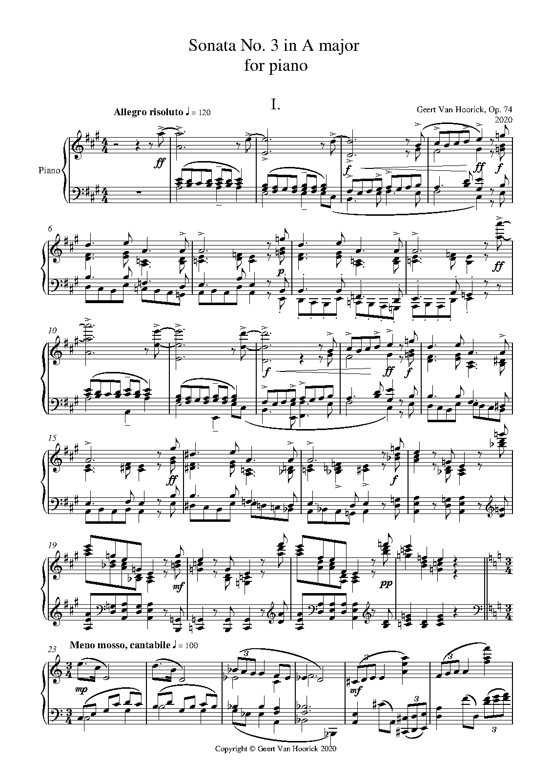 The 3rd Piano Sonata is a modern-classical composition, but not really modern (i.e. neo-classical). It consists of three movements. The 1st movement is moderately fast, resolute and in sonata-form, the 2nd movement is a kind of slow Trauermarsch based on one theme, the 3rd and final movement is moderately fast, joyful and singing, and in sonata-form with two short themes (altough in the development section a third theme is brought in). Digital performance using Sibelius 6 and Garritan Personal Orchestra. Moving score videos on my YouTube-channel.