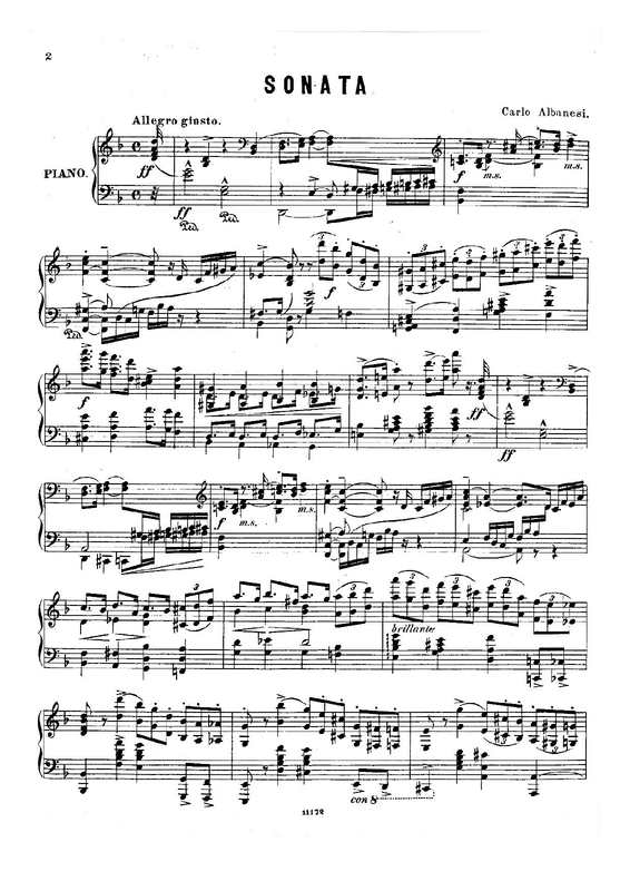 See Monatsbericht (1899), p.152 (published by Simrock)- Also reviewed in Musical News p.152 of June 17 1899 issue (review of Sonata in D minor by Albanesi. Gives the dedicatee as Sir Walter Macfarren). Mentions that the 2nd movement of the sonata they're reviewing is in F major (as here) and mentions that the scherzo's trio is marked "Quasi preghiera". So almost certainly a review of the same sonata. The unknown-publisher (because title page and cover page are absent) scan above could be the Simrock 1899 (n.d. according to library catalogs, not ©) first edition- the plate is consistent.