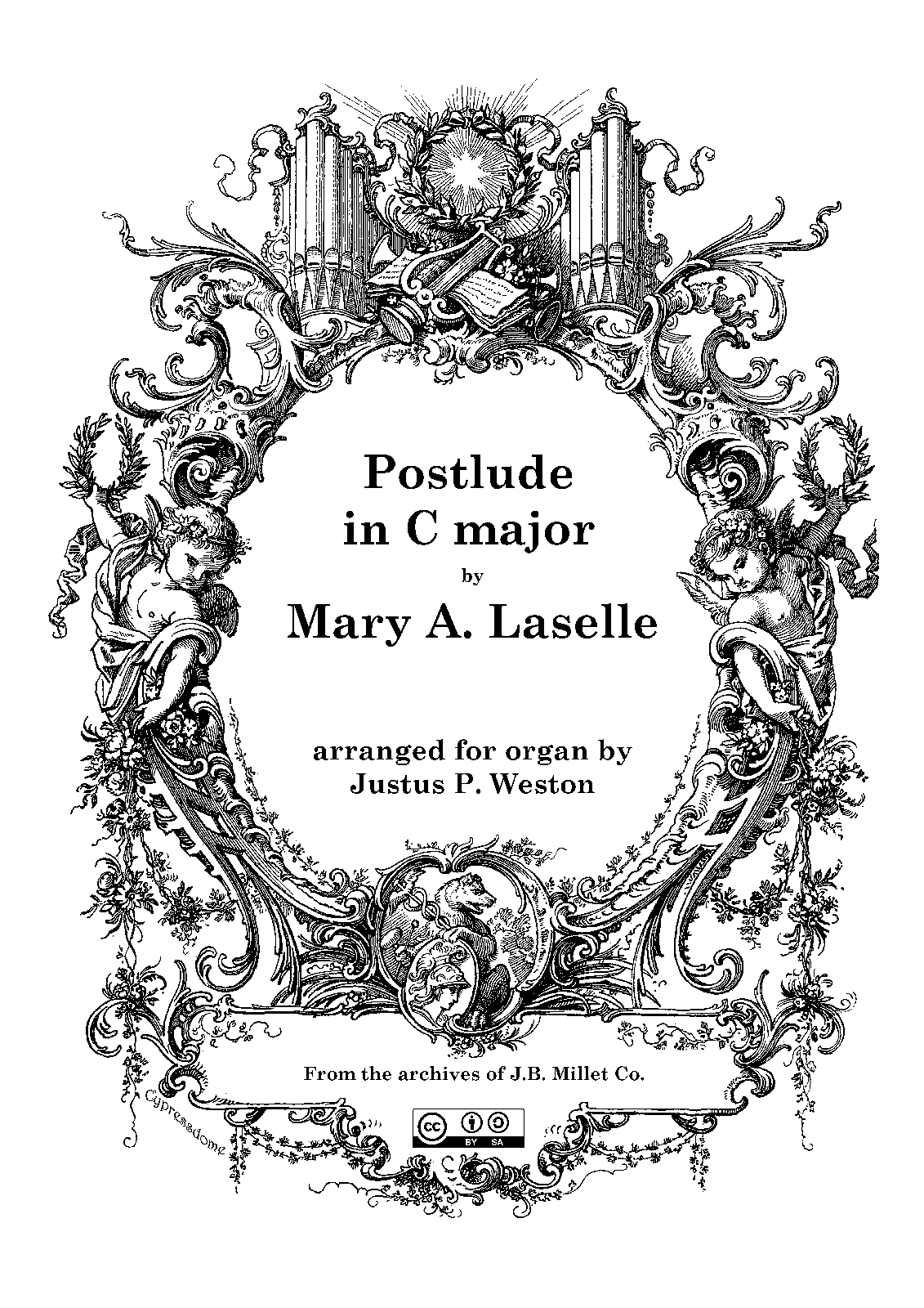It is unknown if the work was ever published. The work did not appear in Vox Organi or apparently either of the other major music publications by Millet. The ms. of Laselle's original (2 staves) has the following written in the upper left corner: "Mr. Weston Please make organ arrangement as agreed AJM." The cover page of Weston's arrangement for organ (3 staves) has the following written on it: "Arranged for Nuo Music." Perhaps this was a musical periodical published by Millet. The arranger, Justus P(ersons) Weston (ca.1840–1917), may perhaps only be known for his work on Laus organi which was a 3 volume set of arrangements for harmonium of the works that originally appeared in Vox Organi.