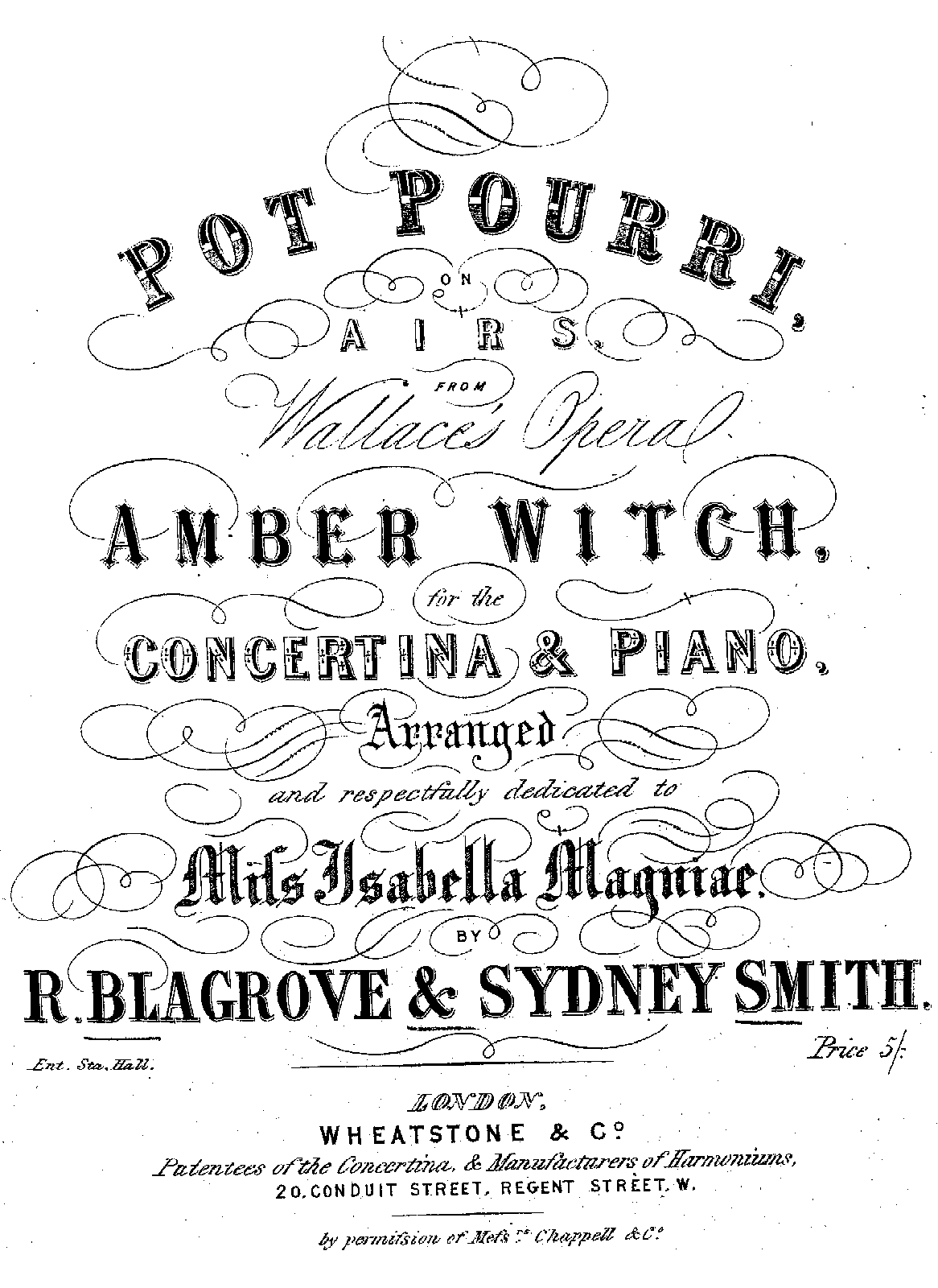 | Work Title | Pot Pourri, on Airs from Wallace’s Opera Amber Witch, for the Concertina & Piano |