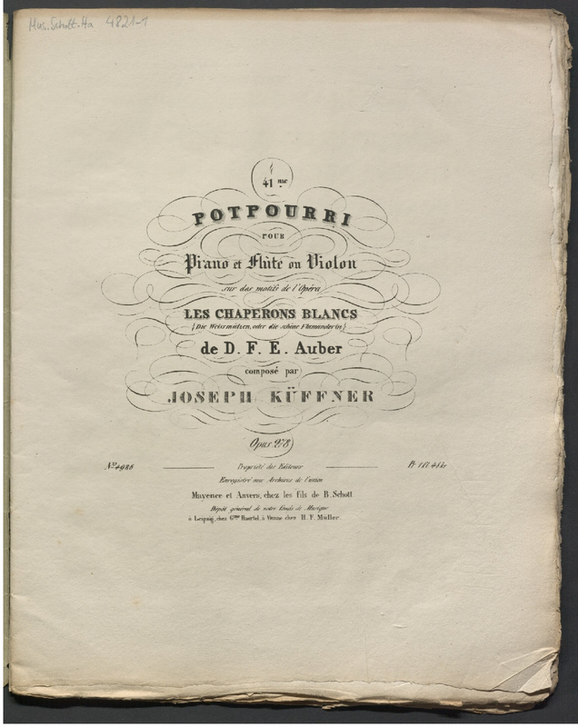 | Alternative. Title | 41me. potpourri pour piano et flûte ou violon sur des motifs de l'opéra Les chaperons blancs (Die Weißmützen, oder die schöne Flamänderin) de D. F. E. Auber |