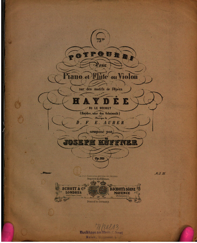 | Alternative. Title | 73me potpourri pour piano et flûte ou violon sur des motifs de l'opéra Haydée ou le secret (Haydee, oder das Geheimnis), musique de D.F.E. Auber |