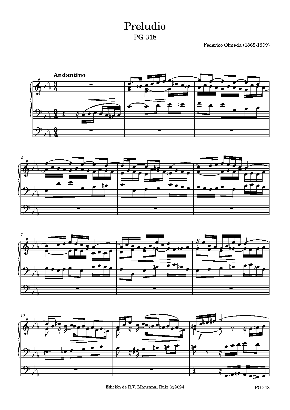 This work relates to number 318 according to catalog by Miguel Ángel Palacios Garoz (listed on "Federico Olmeda, un maestro de capilla atípico" by Miguel Ángel Palacios Garoz, 2003, ISBN 84-87876-90-0 pg 349). Edition is made from the original manuscript available on the "Archivo de la Diputación de Burgos - Fondo Olmeda", box 4, kindly provided by the Archive and by Mr. Rodrigo CALZADA. Also using photos of the same manuscript taken on the 4th December 2023. WARNING: This edition is meant to be used by amateurs, not by professionals. It is NOT a professional edition.