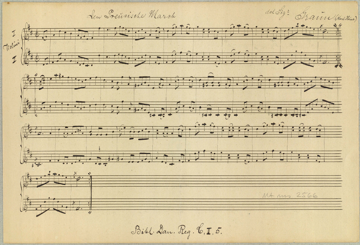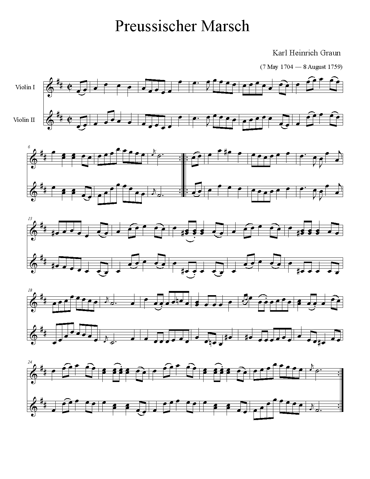 Just Typeset the March. Some of the phrasing is a bit strange where one violin is slured and the other is not, but I left things as per the original. There is also one measure in there with a little strange harmony that is a bit out of place. Graun must of had a sense of humor here. Might be him trying to imitate the sound of a drum. I suspect this piece is from one of his operas.