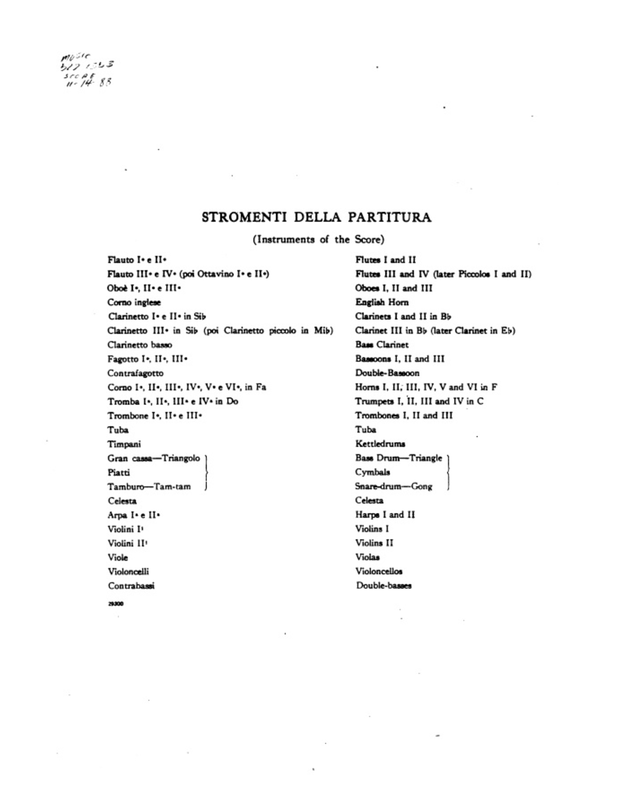 timpani, triangle, snare drum, bass drum, cymbals, gong celesta, 2 harps, strings
