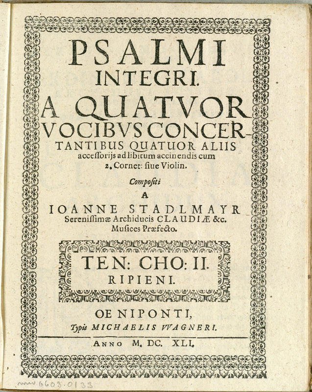 | Alternative. Title | Psalmi Integri a 4 Vocibvs Concertantibvs Quatuor aliis accessoriis ad libitum accinendis cum 2. Cornet siue Violin. |