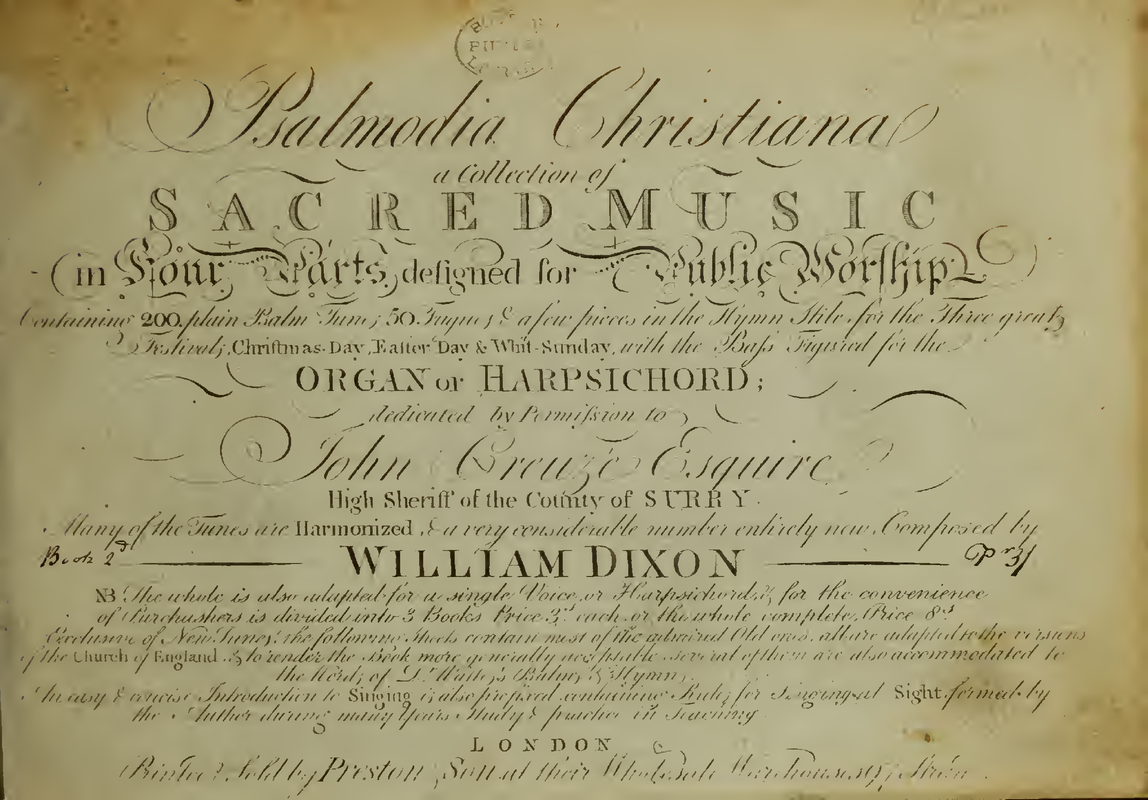 - Psalmodia Christiana a Collection of Sacred Music in Four Parts designed for Public Worship - Containing 200 plain Psalm Tunes, 50 Fugues, & a few pieces in the Hymn Stile, for the Three great Festivals, Christmas-Day, Easter Day & Whit-Sunday, with the Bass Figured for the Organ or Harpsichord; ... Many of the Tunes are Harmonized, & a very considerable number entirely new, Composed by William Dixon. NB. The whole is also adapted for a single Voice or Harpsichord, & for the convenience of Purchasers is divided into 3 Books Price 3s each, or the whole complete, Price 8s. Exclusive of New Tunes, the following sheets contain most of the admired Old ones, all are adapted to the versions of the Church of England, & to render the Book more generally acceptable, several of them are also accommodated to the Words of Dr. Watts's Psalms & Hymns. An easy & concise Introduction to Singing is also prefixed, containing Rules for Singing at Sight, formed by the Author during many Years Study & practice in Teaching.