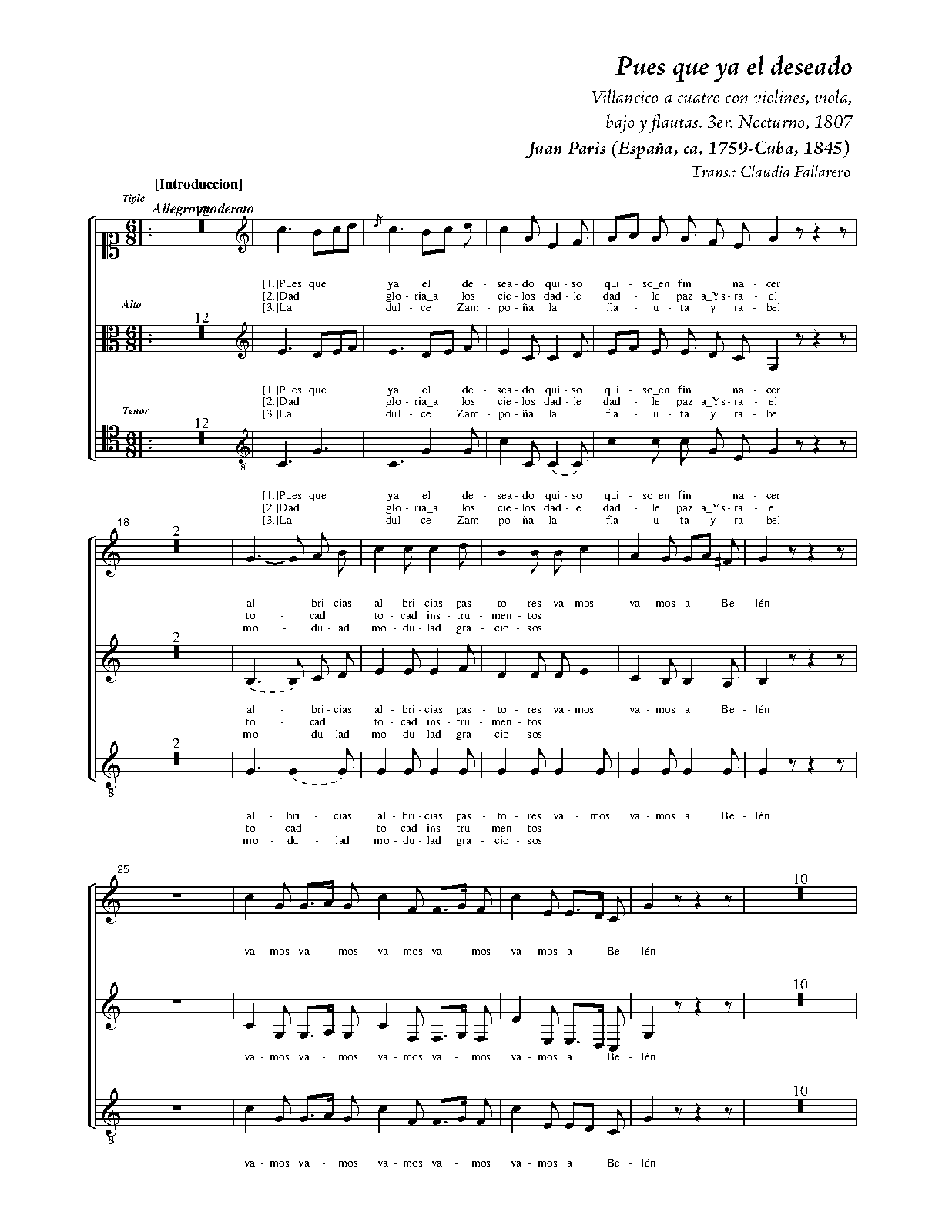 Villancico a cuatro con violines, viola, bajo y flautas. 3er. Nocturno, 1807. Manuscrito localizado en SBEC, Juan Paris, Exp. 04.