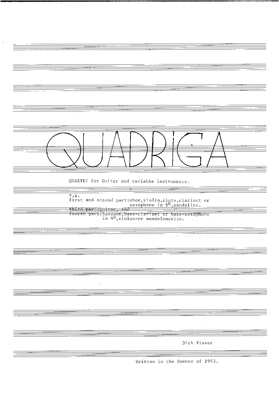 | Extra Information | QUARTET for guitar and variable instruments. E.g. first and second part : oboe, violin, flute, clarinet or saxophone in Bb, mandolin, third part: guitar, and fourth part: bassoon, bass-clarinet or bass-saxophone in Bb, violon- or mandoloncello [Dick Visser] |
