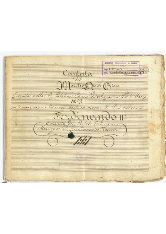 - Cantata / del / Maestro Nic.la de Giosa / Eseguita nella R. Palatina Chiesa di Acquaviva il di 6 Marzo / 1853 / per l'inaugurazione del mezzo busto in marmo di Sua Maesta / Ferdinando II. / a richiesta del Prelato Ordinario / Monsignor D. Giandomenico Falconi</span>