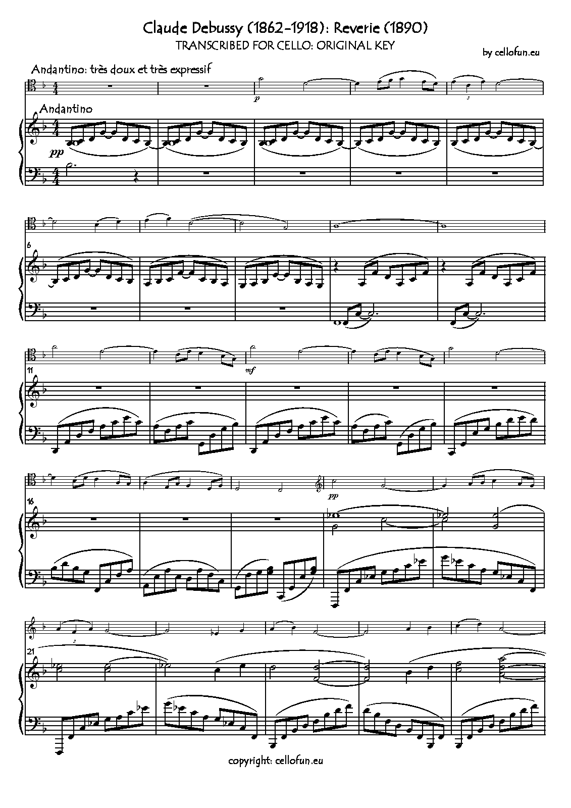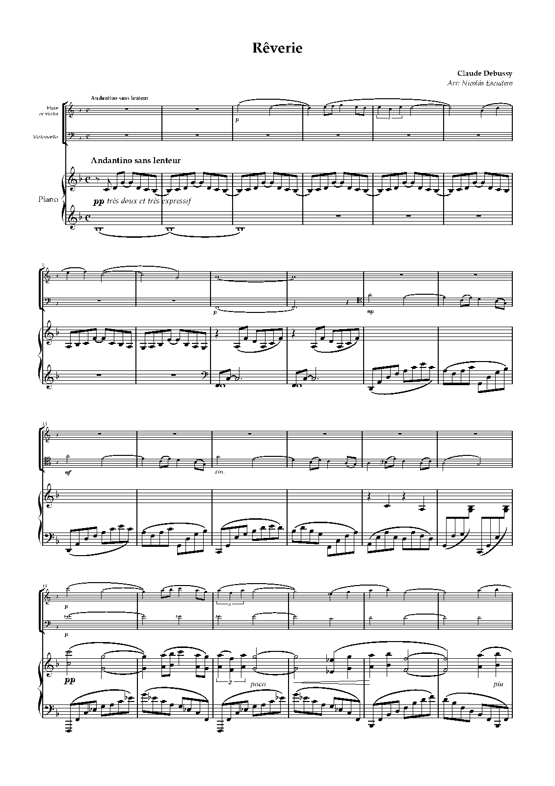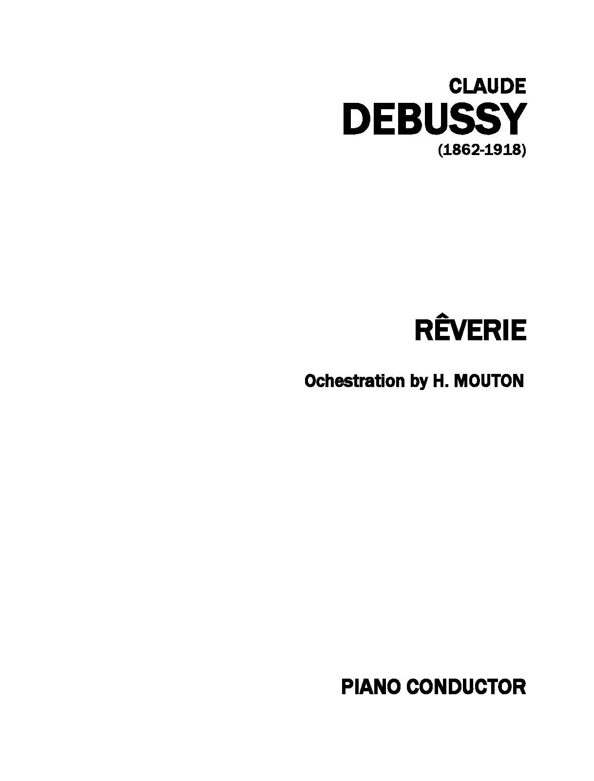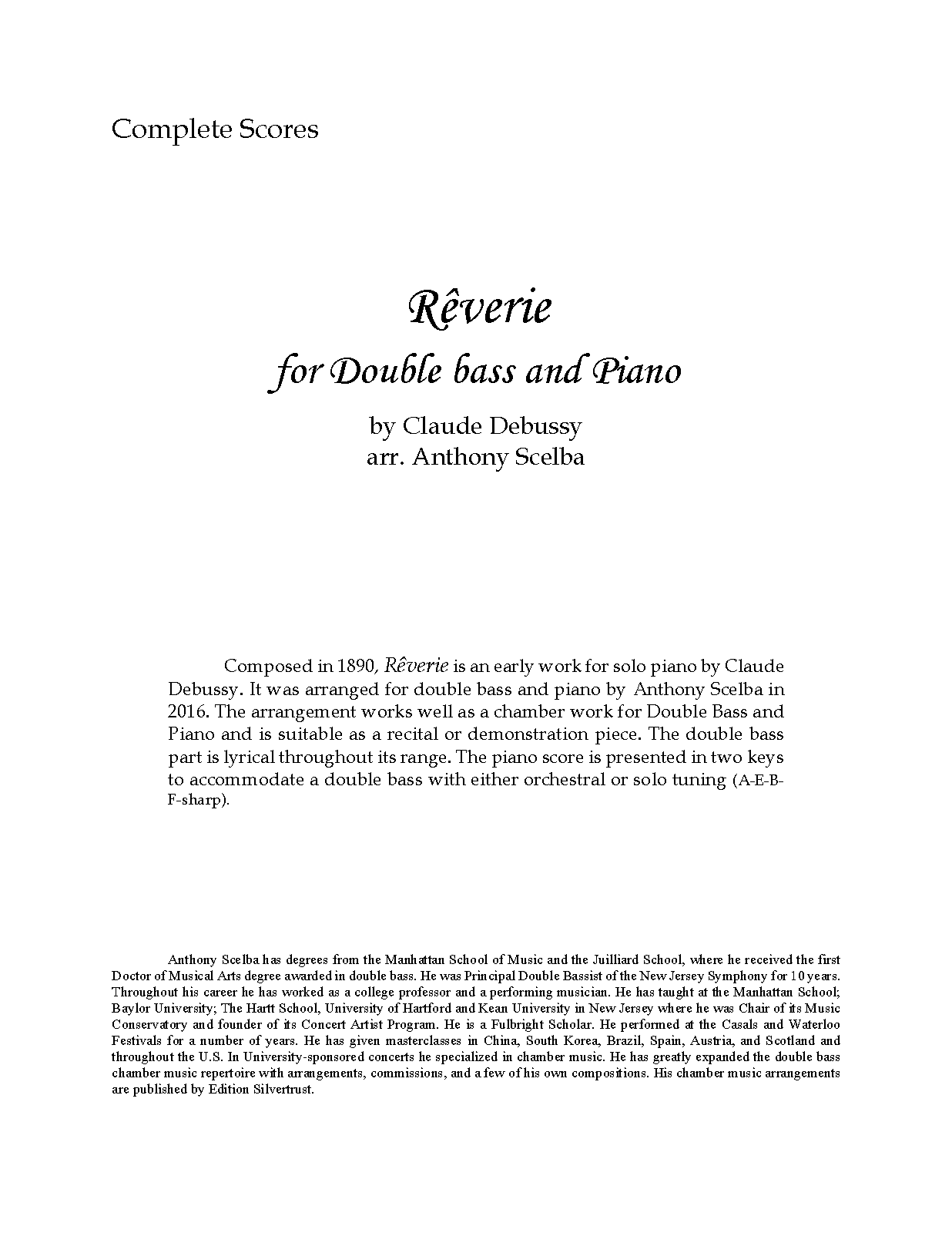Misc. Notes Rêverie for double bass and piano is based on the solo work for piano by Claude Debussy. It was arranged for double bass and piano by Anthony Scelba in 2016. The arrangement works well as a chamber work for Double Bass and Piano and is suitable as a recital or demonstration piece. The double bass part is lyrical throughout its range. The piano score is presented in two keys to accommodate a double bass with either orchestral or solo tuning (A-E-B-F-sharp).