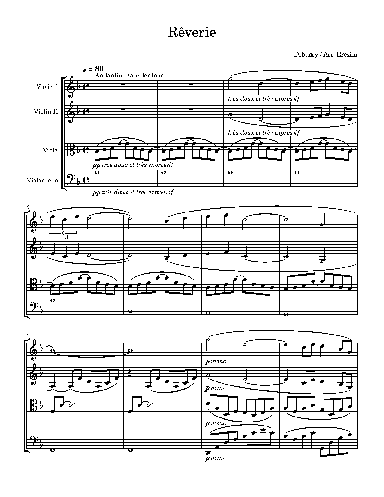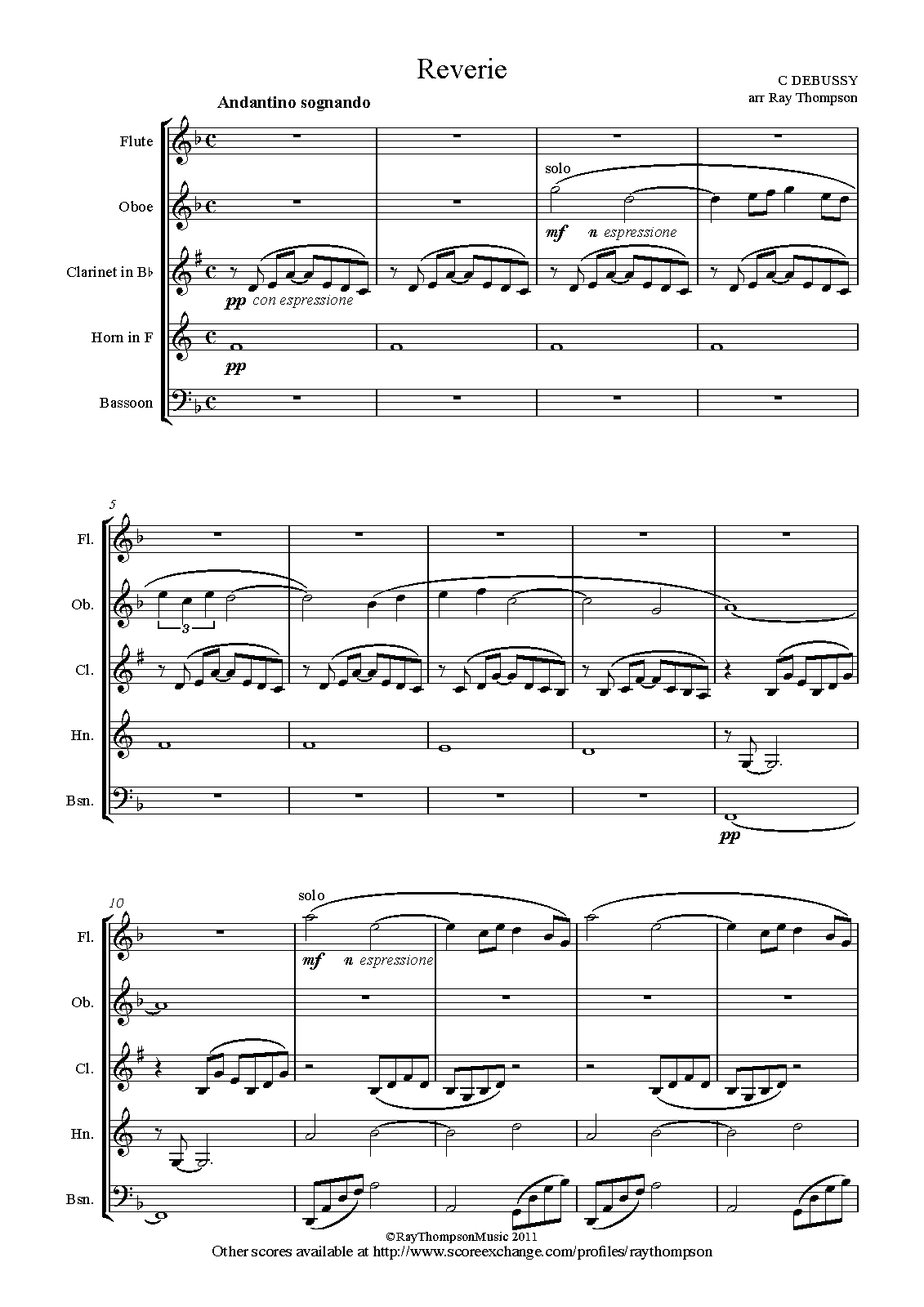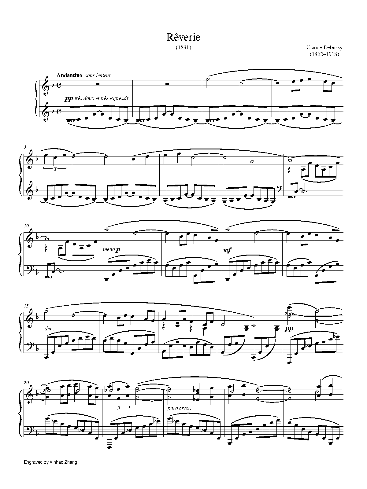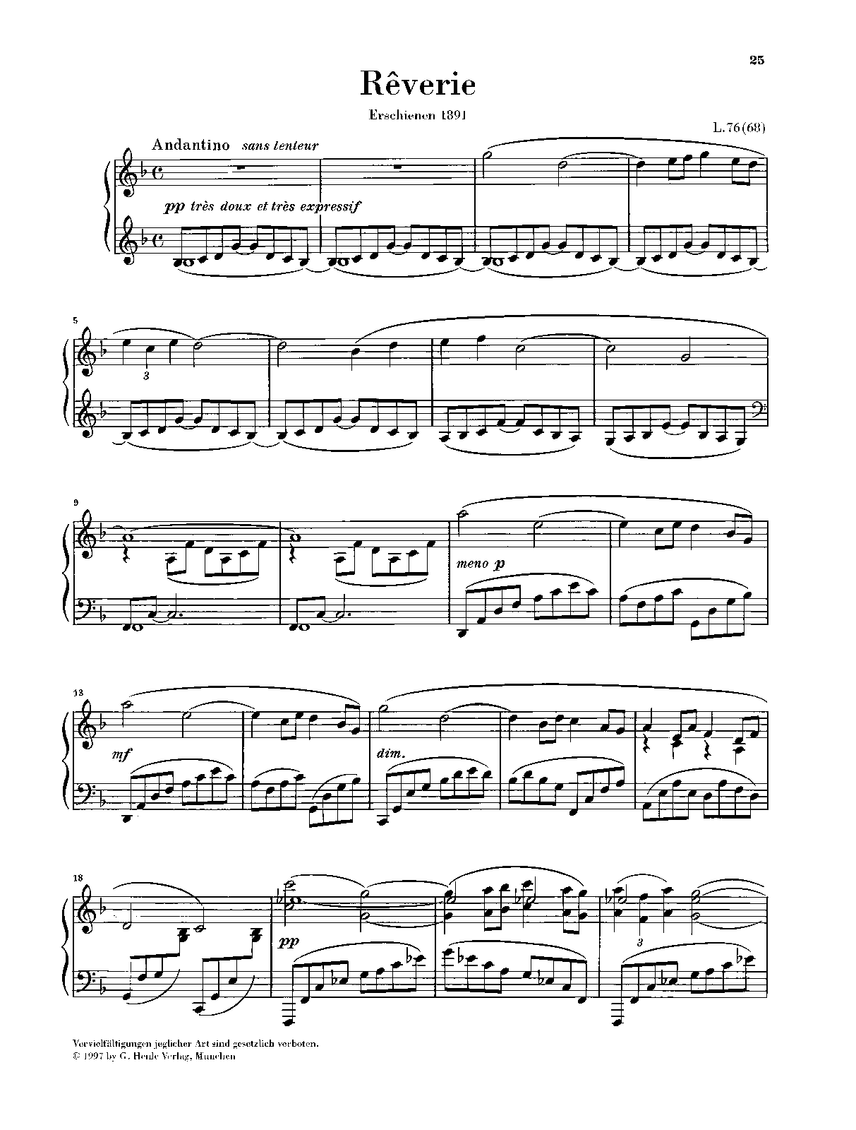 Misc. Notes Rêverie for double bass and piano is based on the solo work for piano by Claude Debussy. It was arranged for double bass and piano by Anthony Scelba in 2016. The arrangement works well as a chamber work for Double Bass and Piano and is suitable as a recital or demonstration piece. The double bass part is lyrical throughout its range. The piano score is presented in two keys to accommodate a double bass with either orchestral or solo tuning (A-E-B-F-sharp).