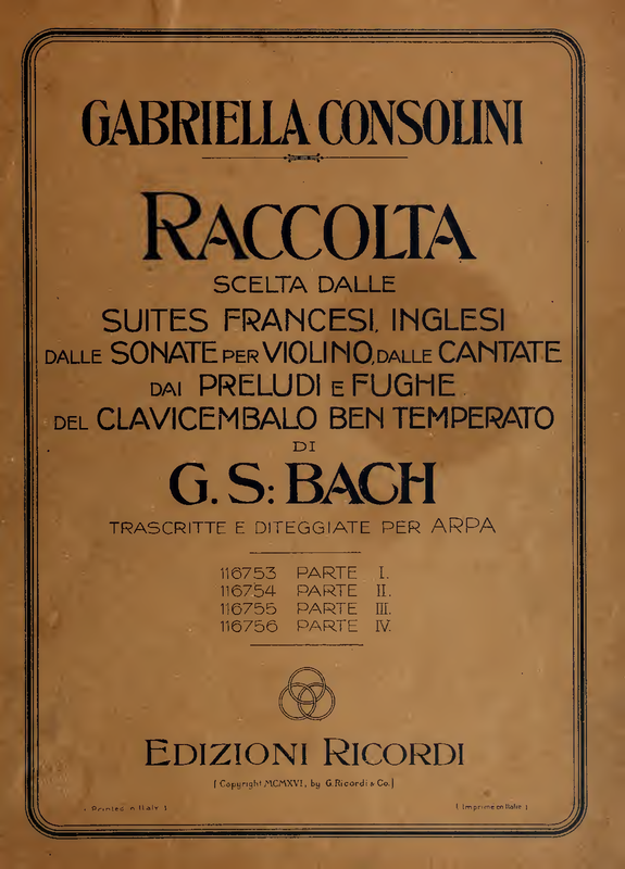 | Alternative. Title | Raccolta scelta dalle suites francesi, inglesi, dalle sonate per violino, dalle cantate dai preludi e fughe del clavicembalo ben temperato trascritte e diteggiate per arpa |