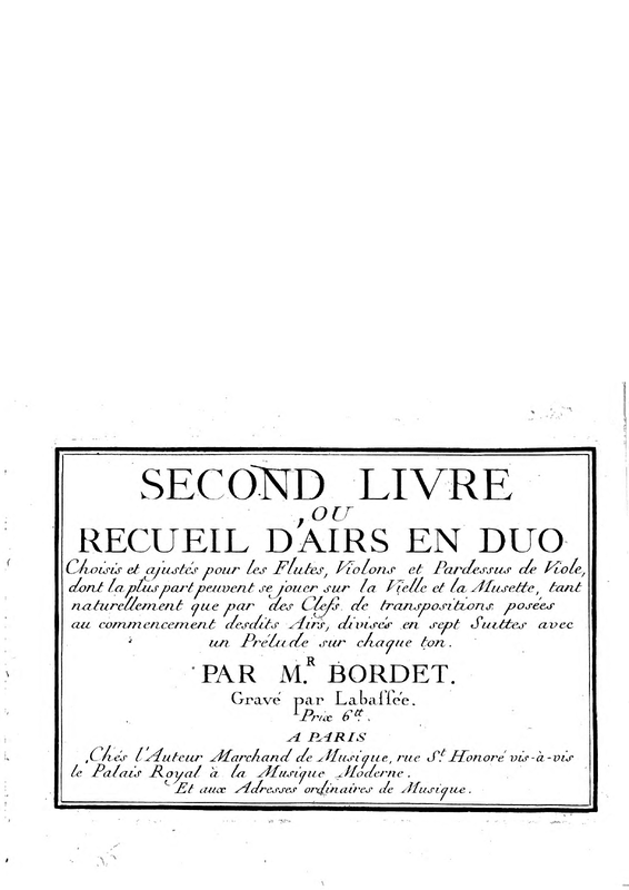 Second Livre ou Recueil d'Airs en Duo Choisis et ajustés pour les Flutes, Violons et Pardessus de Viole dont la plus part peuvent se jouer sur la Vielle et la Musette, tant naturellement que par des Clefs de transpositions posées au commencement desdits Airs, divisés en sept Suittes avec un Prélude sur chaque ton.