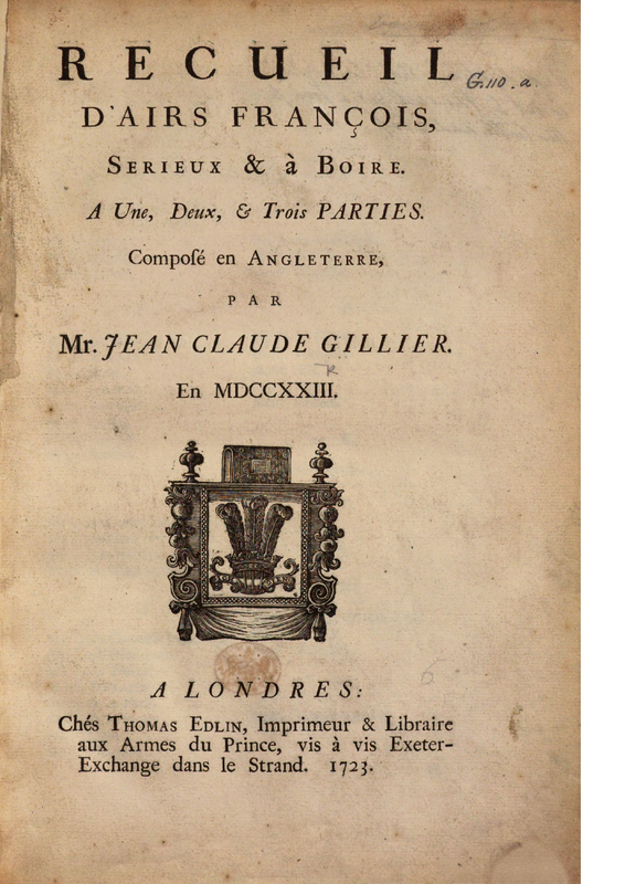 Recueil d'Airs François, Serieux - à Boire. A Une, Deux, & Trois Parties. Composé en Angleterre, par Mr. Jean Claude Gillier. En MDCCXXIII.