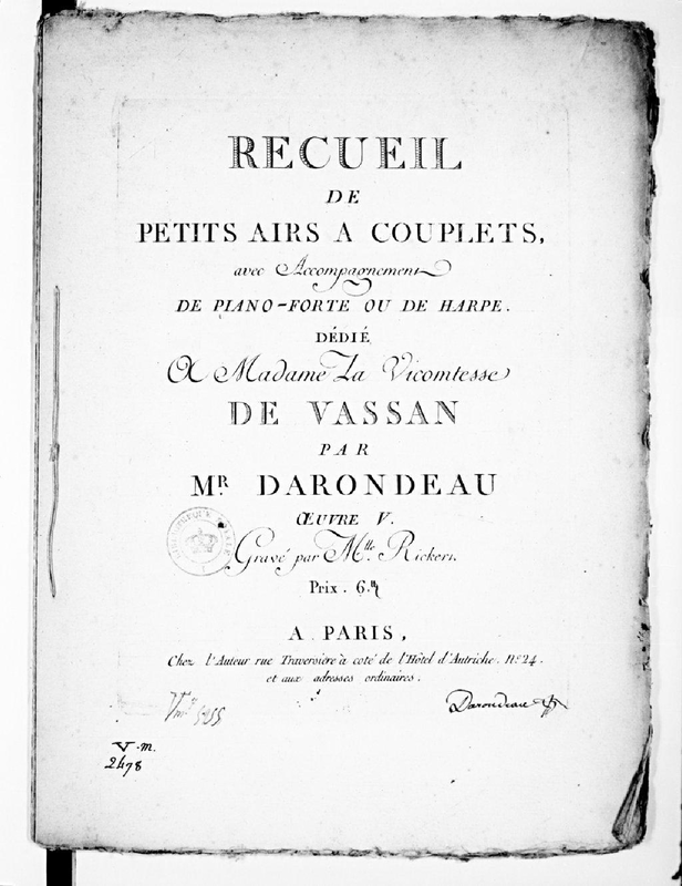 | Alternative. Title | Recueil de petits airs à couplets avec accompagnement de piano forte ou de harpe |