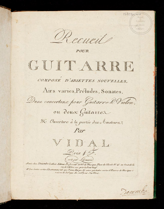 | Alternative. Title | Recueil pour guitarre compose d'Ariettes nouvelles, Airs Varies, Preludes, Sonates, Duos concertans pour Guitarre et Violon, ou deux Guitarres & Ouvertures a la portee des amateurs |