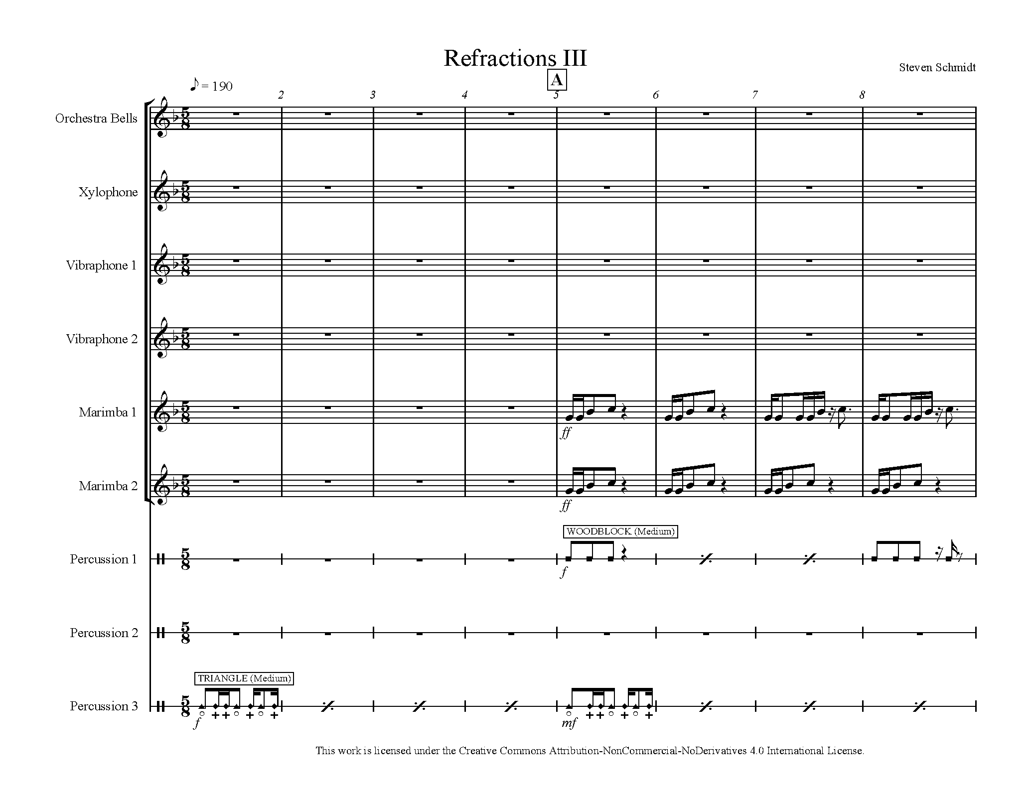 | Genre Categories | Pieces; For 3 percussion, bells, xylophone, 2 marimbas, 2 vibraphones; Scores featuring percussion soloists; |