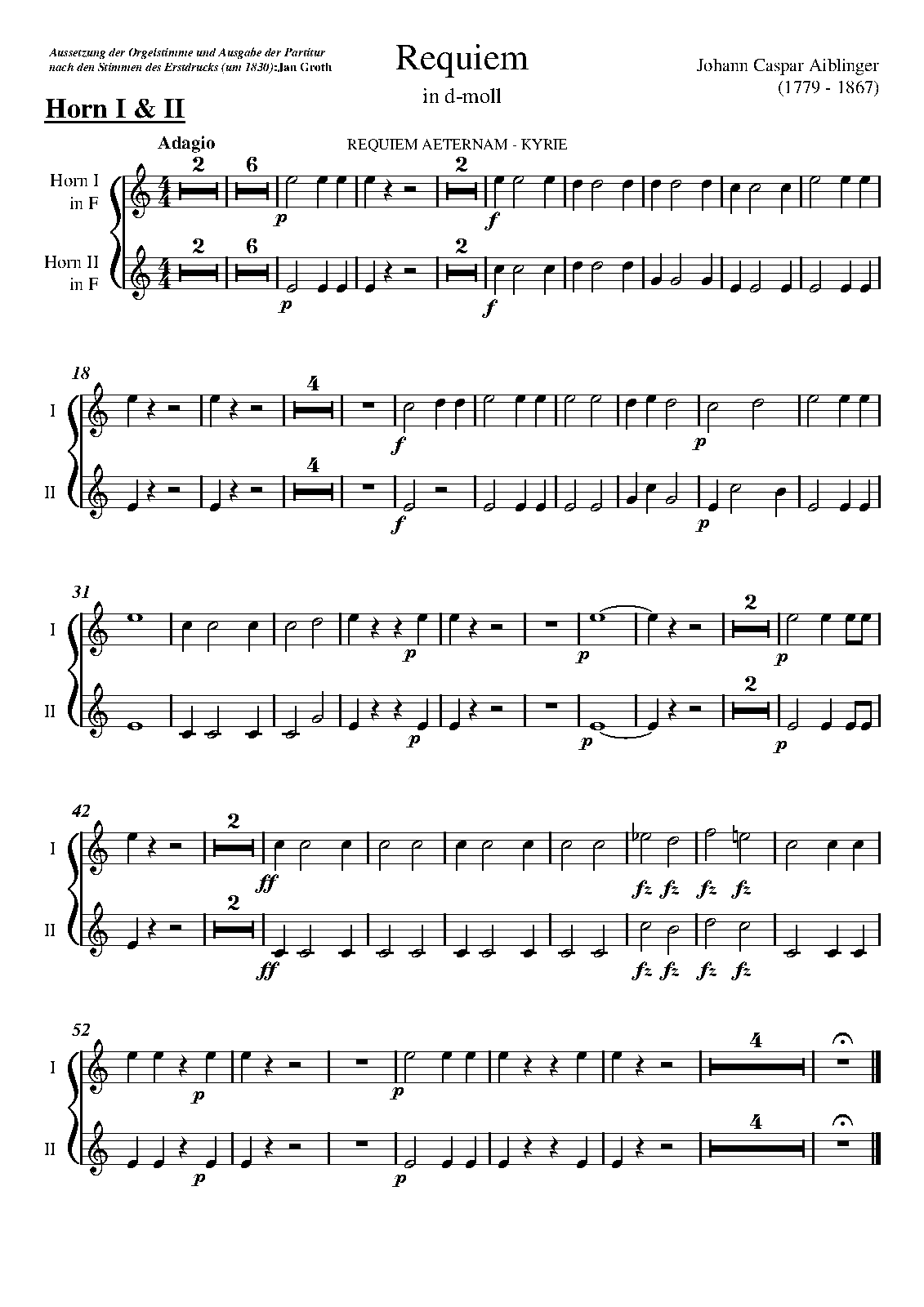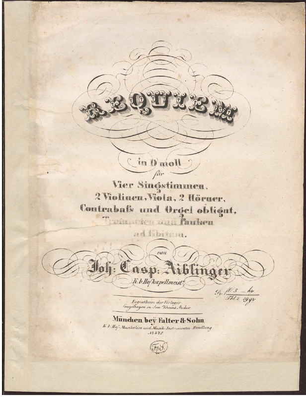 | Alternative. Title | Requiem in D moll fur Vier Singstimmen, 2 Violinen, Viola, 2 Hoerner, Contrabass und Orgel obligat., Trompeten und Pauken ad libitum |