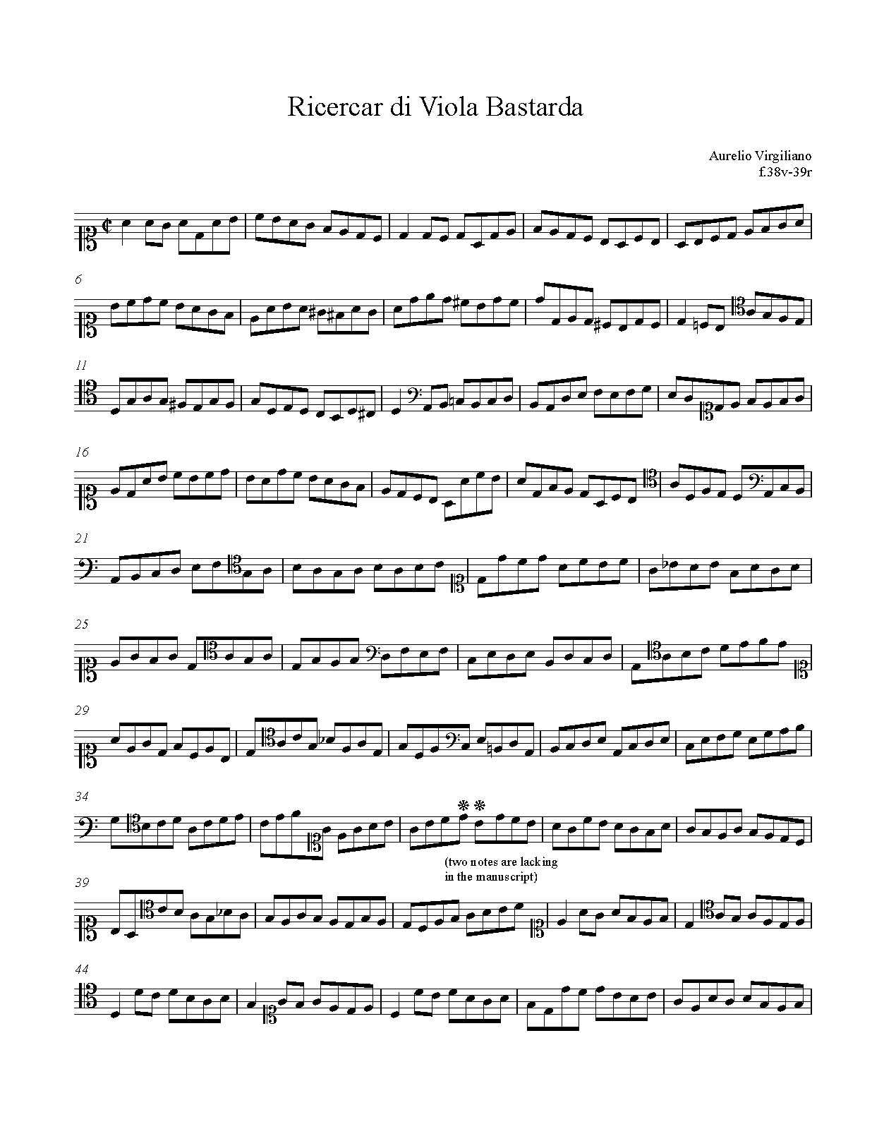 This is the second of 2 works specified for the viola bastarda, by Aurelio Virgiliano from Il dolcimelo. There are 16 pieces in all, but Virgiliano does not number them, nor does he group them according to instrumentation. If using the modern numbering system, this is "(15) Ricercar di Viola bastarda."