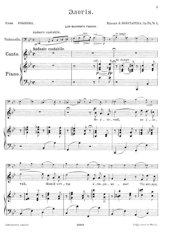 1. Elegie [Элегия "Не улетай, не улетай, живой мечты очарованье"], for High Voice with Cello and Piano