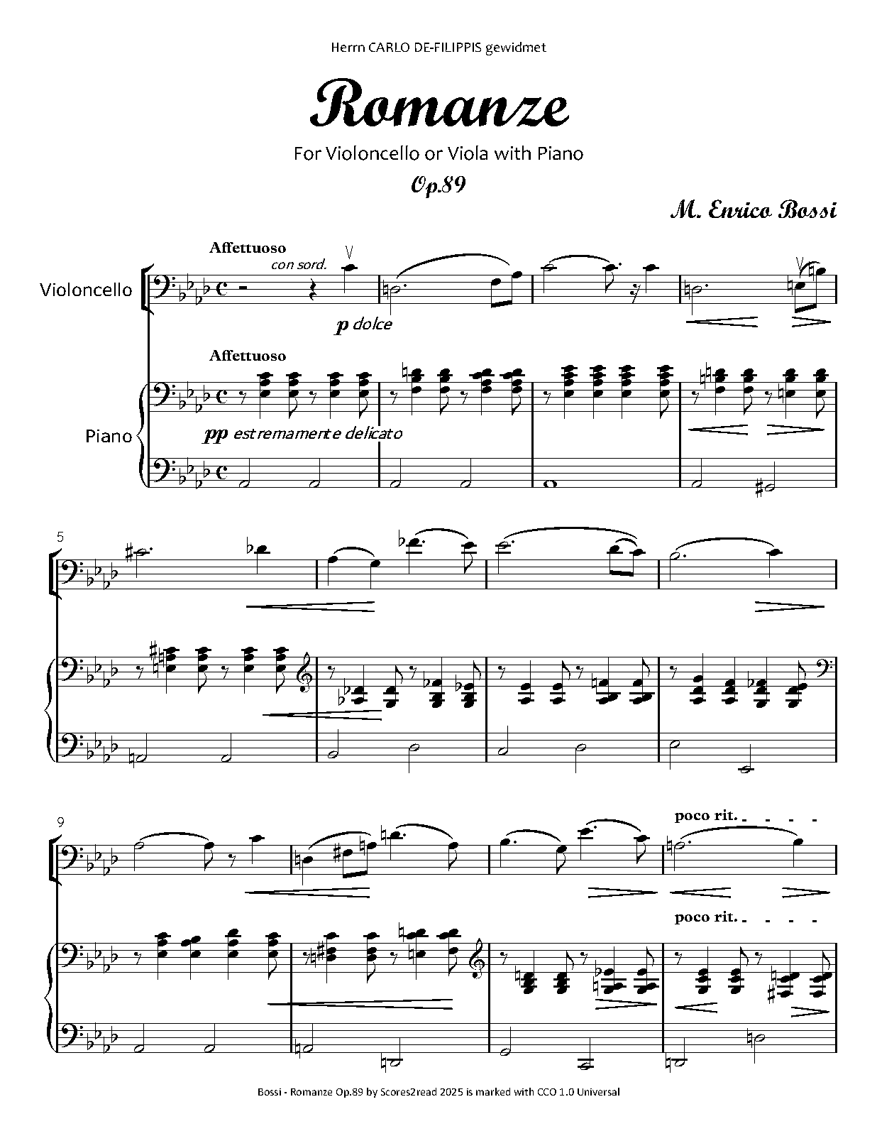 | Extra Information | Recorded (cello and piano) in 2011 as part of Bossi's complete works for violin or cello and piano. Also recorded on a CD of Romances for cello and piano in 1989 (tape, reissued on CD 1992) played by Dorothy and Gary Lewis. Has been transcribed for (may have been recorded in?) a clarinet and piano version also. Possibly published earlier than 1894 (something in Google hints at 1889, but I can't seem to access the original document :( ) - Schissel |