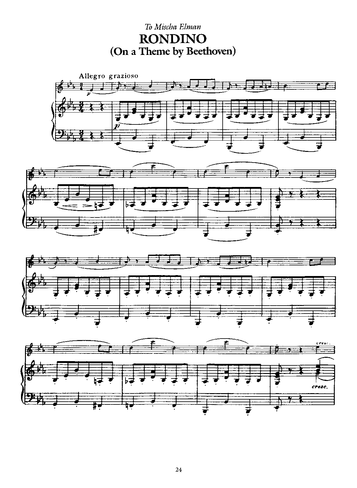 Based on Rondo for Violin and Piano, WoO 41 (Beethoven, Ludwig van); Kreisler has omitted the piano solo sections, and transposed it from G to E♭ major. Kreisler's fingering for the E♭ major version gives the student plenty of practice in playing in high positions on the three lower strings.