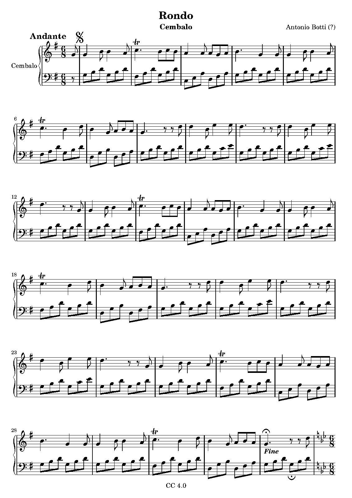 Composer's name is not listed on this manuscript. In the original Ricasoli catalog, the work preceding this piece, and the work following it are both by Abate Antonio Botti, which leads to the suggestion that Botti is likely the composer of this work. RISM-A/II-000124903 identifies Botti as the composer, and identifies this piece as a work based on "Malbrouk s'en va en guerre."
