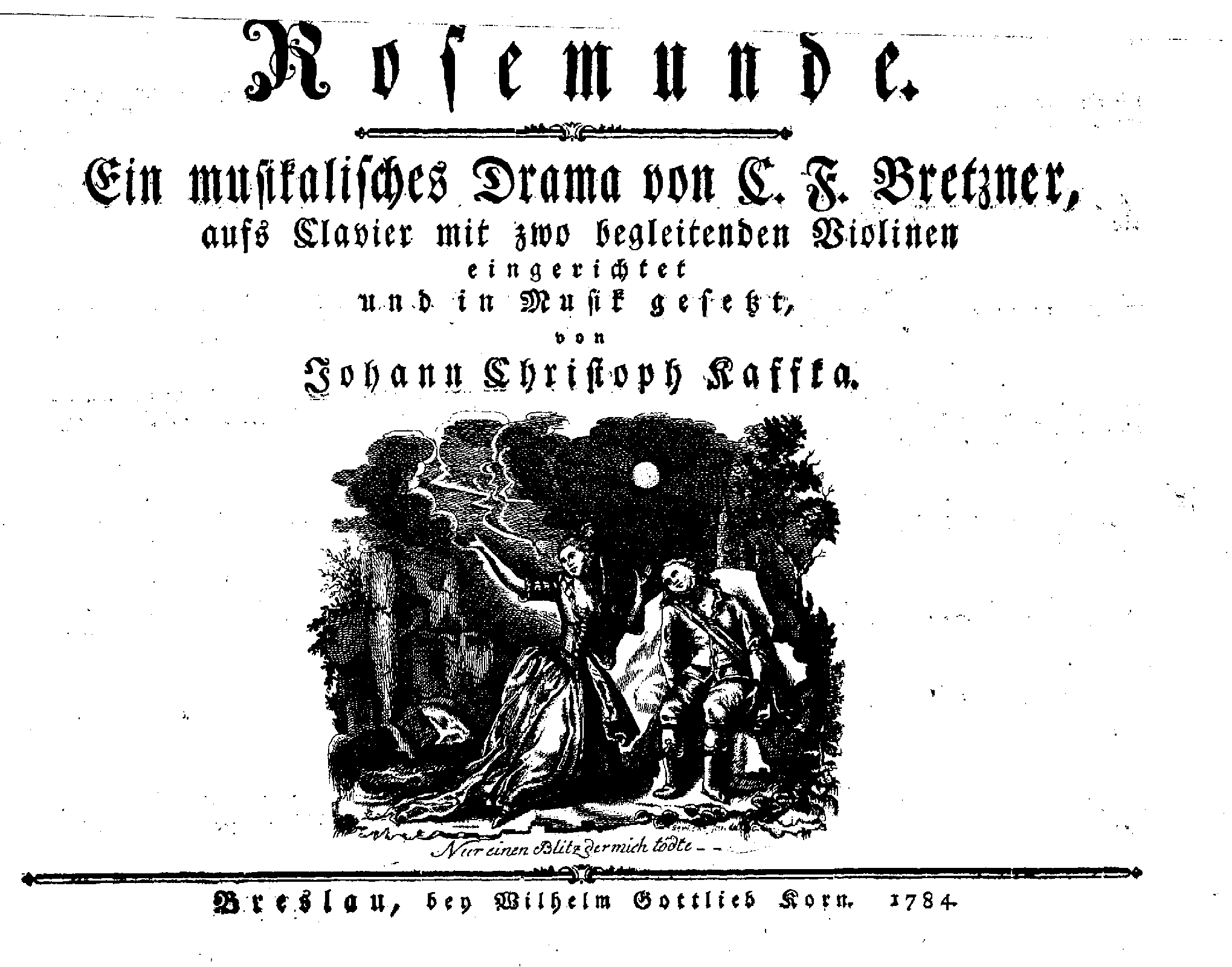 Title: Rosemunde. Ein musikalisches Drama von C. F. Bretzner, aufs Clavier mit zwo begleitenden Violinen eingerichtet und in Musik gesetzt, von Johann Christoph Kaffka