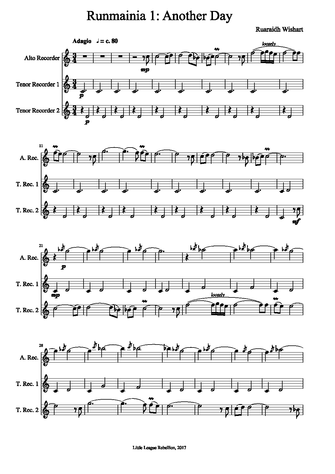 The six sections that make up the Runmainia Suite follow the emotional journey of a run from its early morning stretches to enjoying the view at the top of a hill after a pretty tough ascent. In keeping with the terrain David explores, there is a Scottish influence to each section, but players and listeners will also notice influences from classical and pop styles as well. The work is approximately 15 minutes long and is scored for 3 recorder players of upper intermediate to advanced ability. The instrumentation changes regularly throughout, and those on the first and second parts need to be proficient in playing descant / soprano, treble / alto, and tenor recorders.