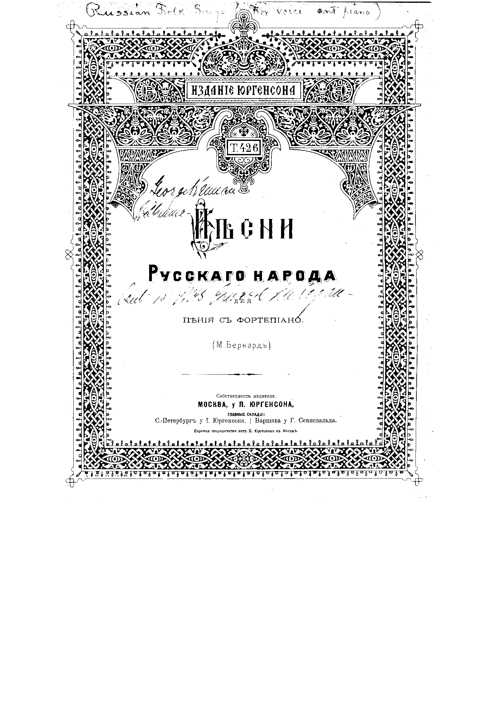 | Alternative. Title | Pyesni russkago naroda. Sobranniya i arranzhirovanniya dlya odnovo golosa s akkompanementom fortepīano |