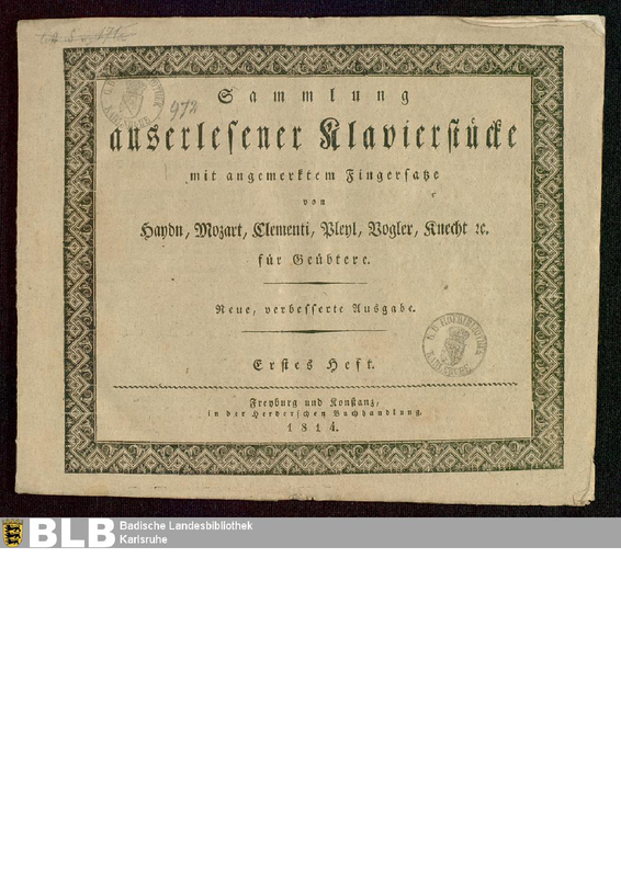| Alternative. Title | Sammlung auserlesener Klavierstücke mit angemerktem Fingersatze von Haydn, Mozart, Clementi, Pleyl, Vogler, Knecht &c. für Geübtere |