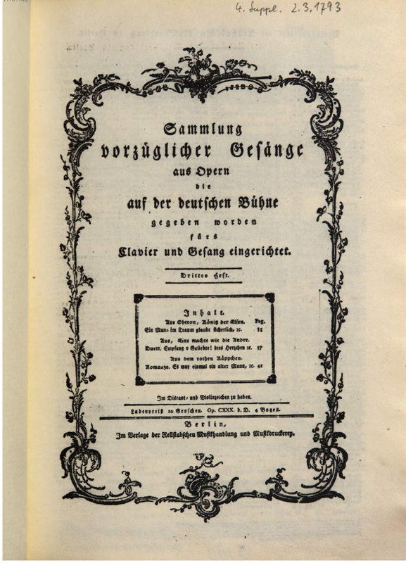 | Alternative. Title | Sammlung vorzüglicher Gesänge aus Opern die auf der deutschen Bühne gegeben worden fürs Clavier und Gesang eingerichtet |