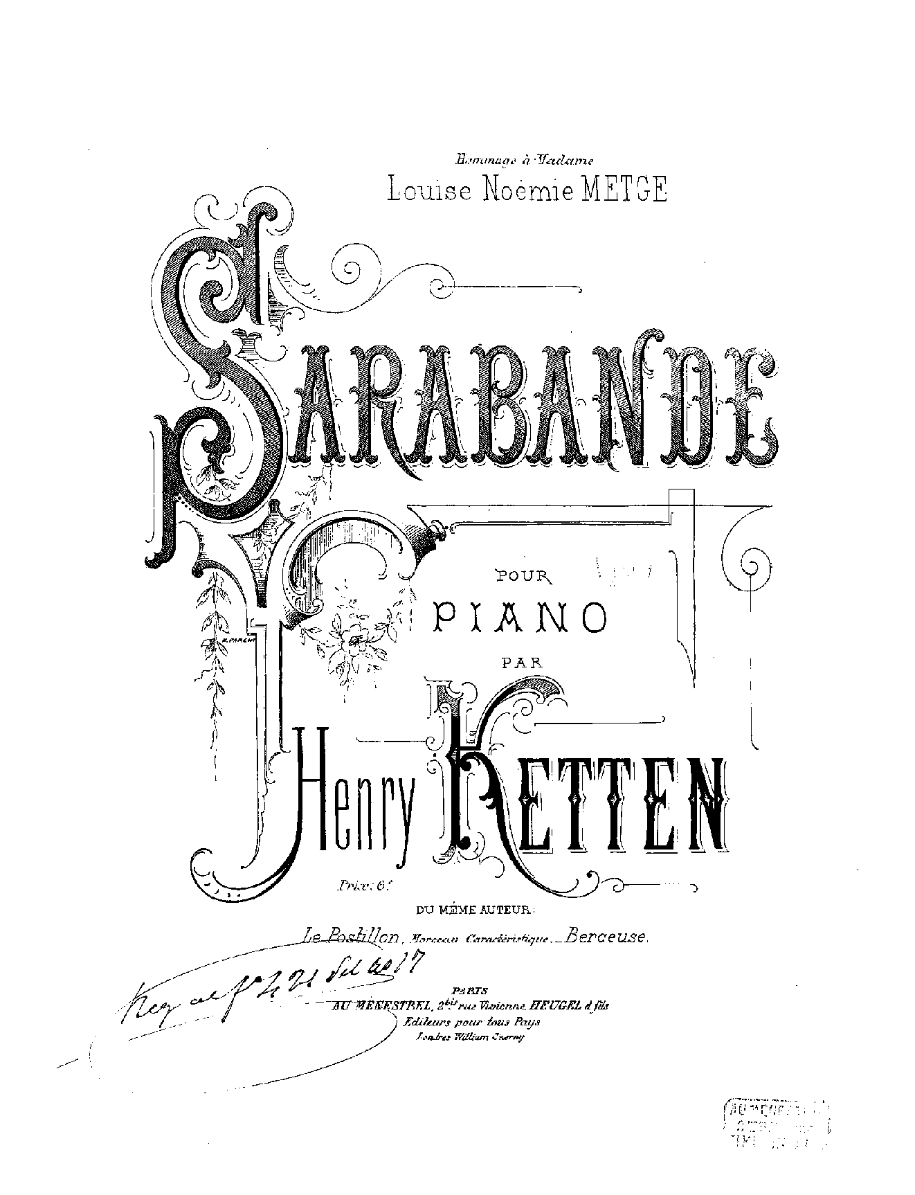 | Dedication | Hommage à Madame Louise Noémie Metge |