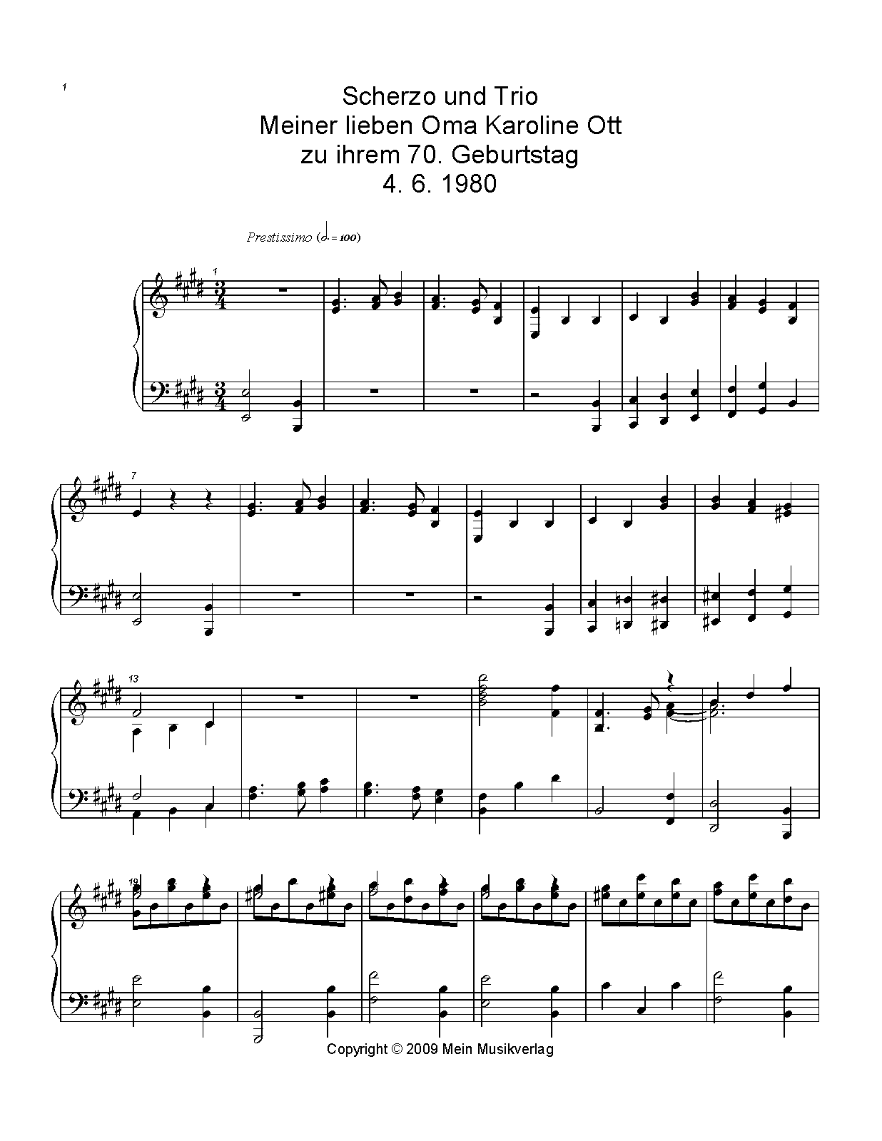 This is the errangement of my old piano piece from 4 June 1980, which I wrote to the 70th anniversary of my very dear grandma Mrs. Karoline Ott. She passed away one year later. I am not sure if the melodies in this work really are my own. In the Trio, which is influenced by folk music from the Alps, it is probably not, since it is in the style of a "Ländler". The same style was used already by Beethoven and Schubert and later by Bruckner. Anyhow, I want to apologize if I made myself guilty of plagiarism. This was never my intention.
