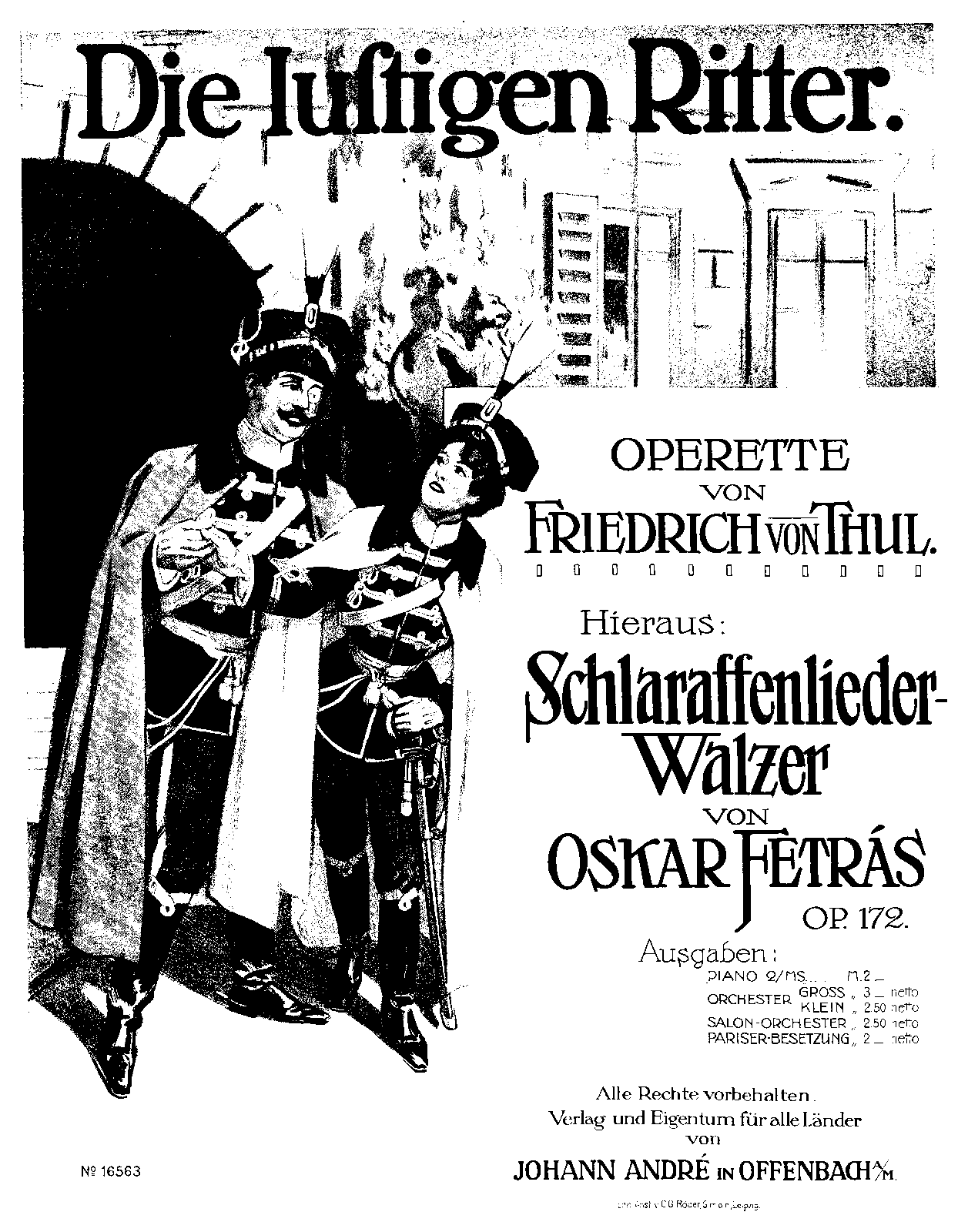 Die lustigen Ritter (operetta in 3 acts) was composed by Karl von Paumgarten (1854–1911) under the pseudonym of Friedrich von Thul. The libretto was by Oskar Friedmann (1872–1929).