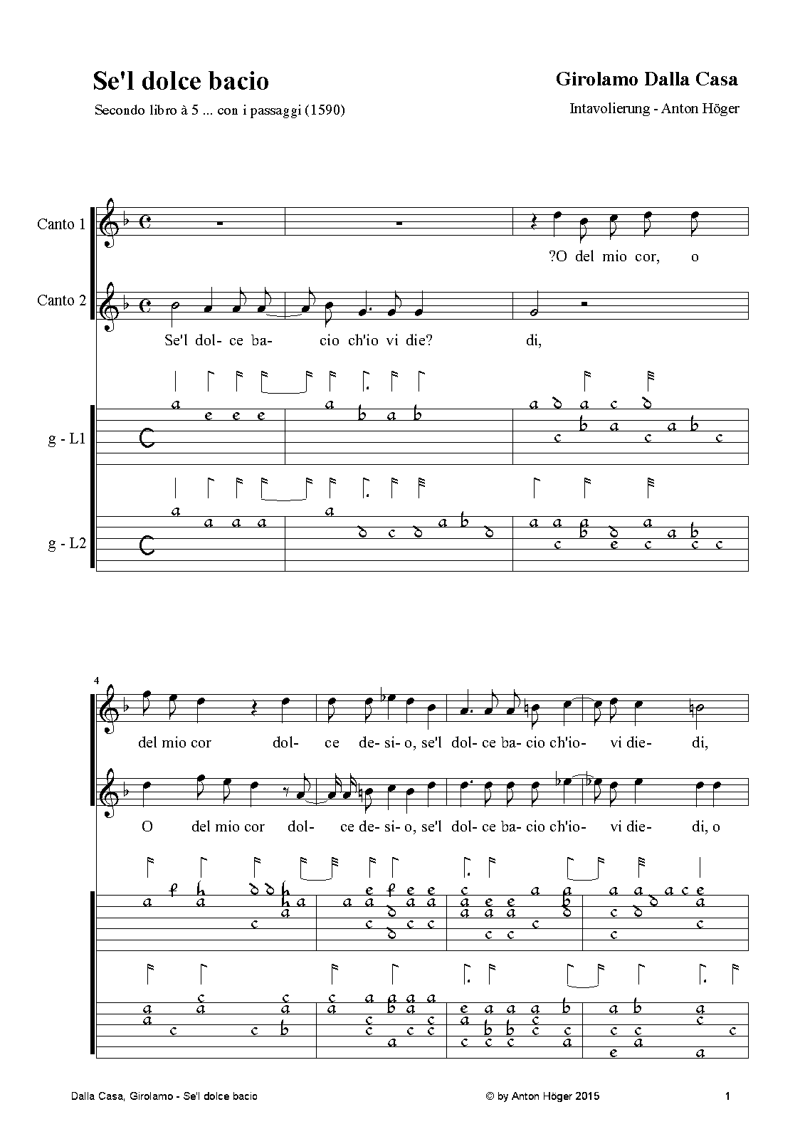 I assume by instrumentation "5 voices" one means as always 5 voices a cappella- that if Dalla Casa had called for continuo this would be listed in the instrumentation line! This is essential. - Schissel (btw is Il secondo libro the same book that has a fuller name "Il secondo libro de madrigali a cinque voci con i passaggi"- which has been recorded at least in part, by the way, on the "Arts" CD label in 2001? That recording has a piece - I assume the same one? called "Se 'l dolce bacio ch'io vi diedi" which in that recording lasts 2'55". So - two recordings, one here in arrangement, one in the original . Ah. From the link above, yes, without bc. :) - Schissel
