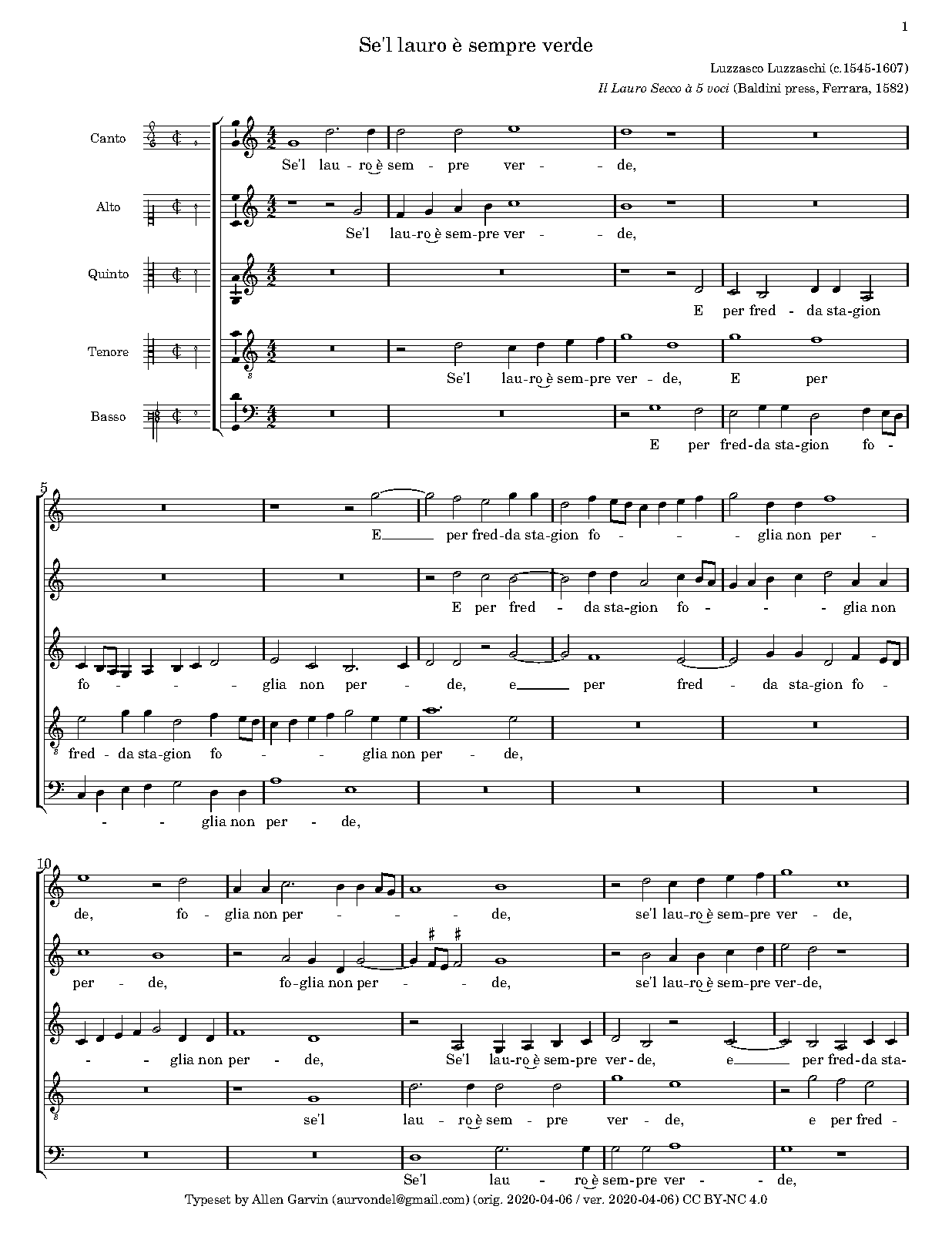 | First Publication | 1582 in Il Lauro Secco à 5 voci (Ferrar: Baldini press) |